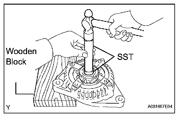 b. Using SST and a wooden block, tap out the bearing.