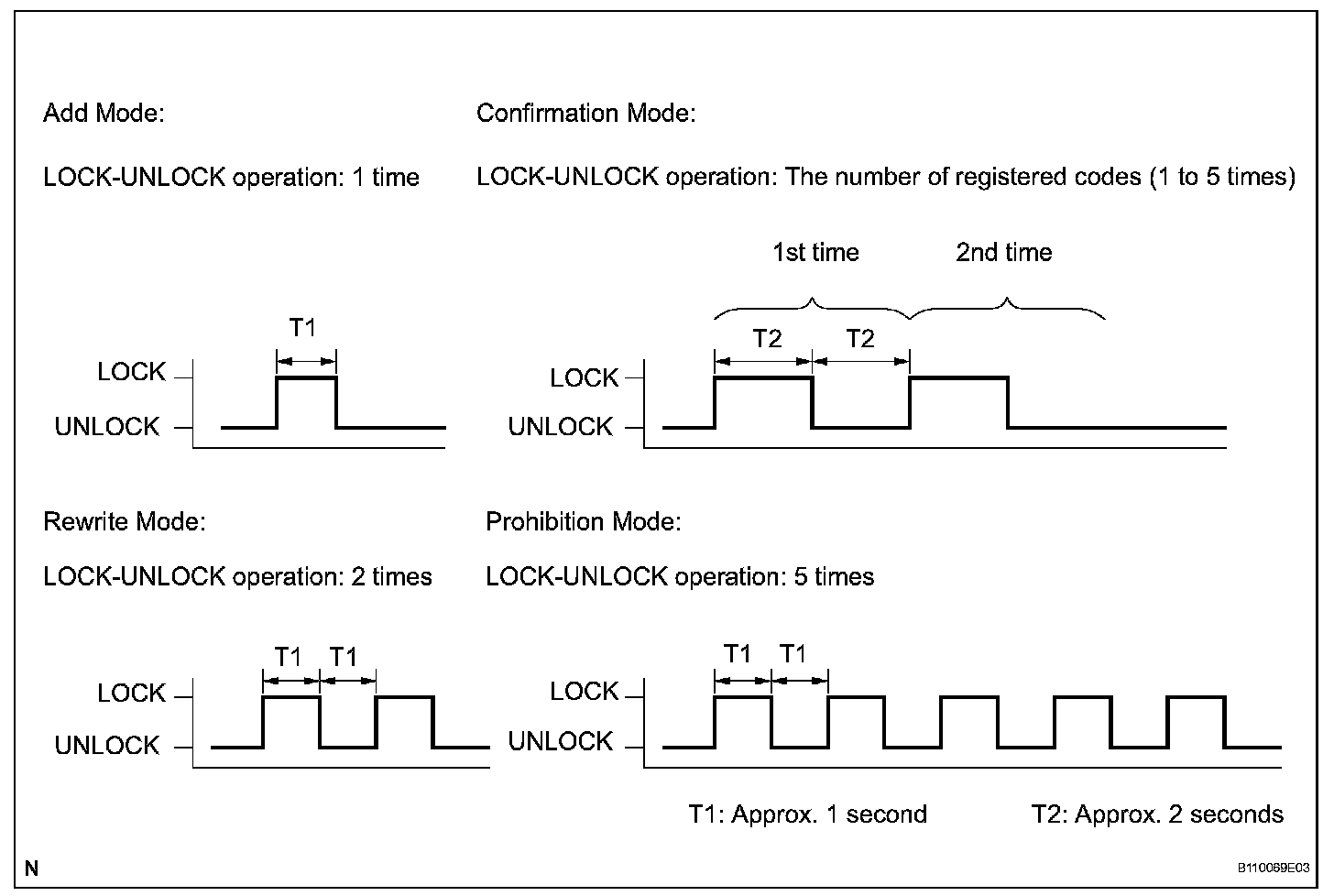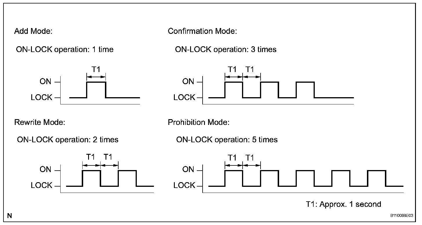 - Add mode is used to register new recognition codes while still retaining codes already registered. This mode is used when a new transmitter is added. If the number of registered codes exceeds 4, the previously registered codes will be erased in order, starting from the first registered code.
