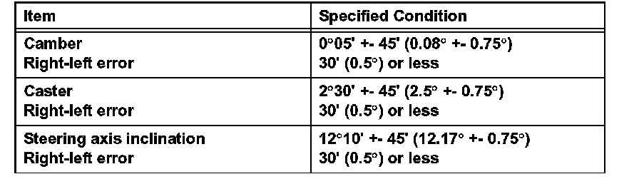 If the steering axis inclination is not within the specified value, after the camber and caster have been correctly adjusted, recheck the steering knuckle and front wheel for wearing or looseness.
