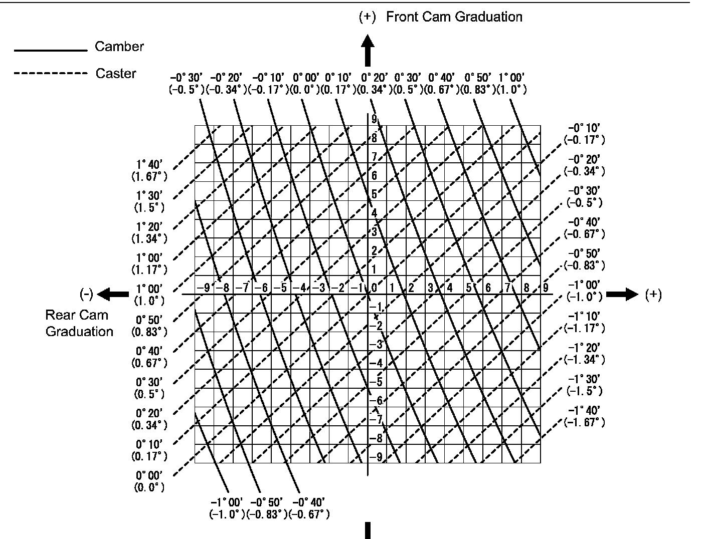 3) As shown in the chart, read the distances from the marked point to the 0 point, and adjust the front and/or rear adjusting cams accordingly.