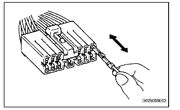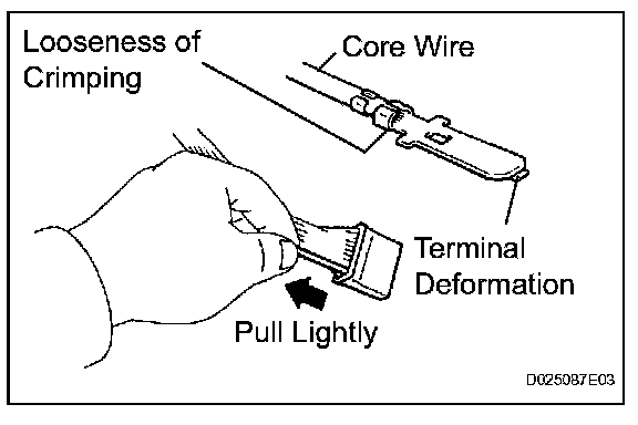 Check by pulling the wire harness lightly from the backside of the connector. Look for unlatched terminals, missing terminals, loose crimps or broken conductor wires. Check visually for corrosion, metallic or foreign matter and water, and bent, rusted, overheated, contaminated, or deformed terminals.