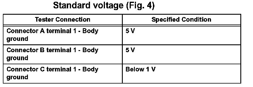1. In a circuit in which voltage is applied to the ECU connector terminal, an open circuit can be checked by conducting a voltage check. With each connector still connected, measure the voltage between the body ground and these terminals (in this order): 1) terminal 1 of connector A, 2) terminal 1 of connector B, and 3) terminal 1 of connector C.