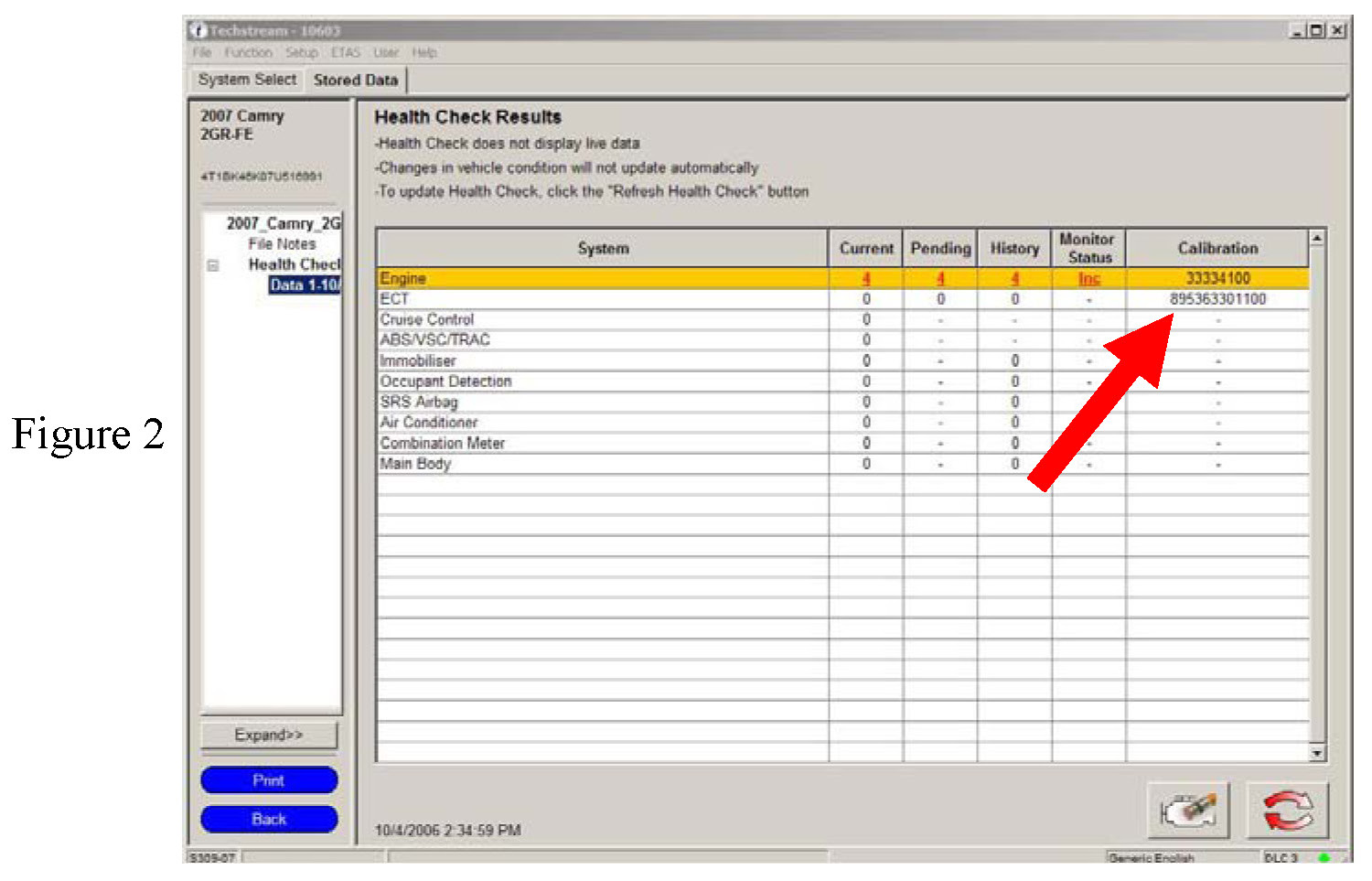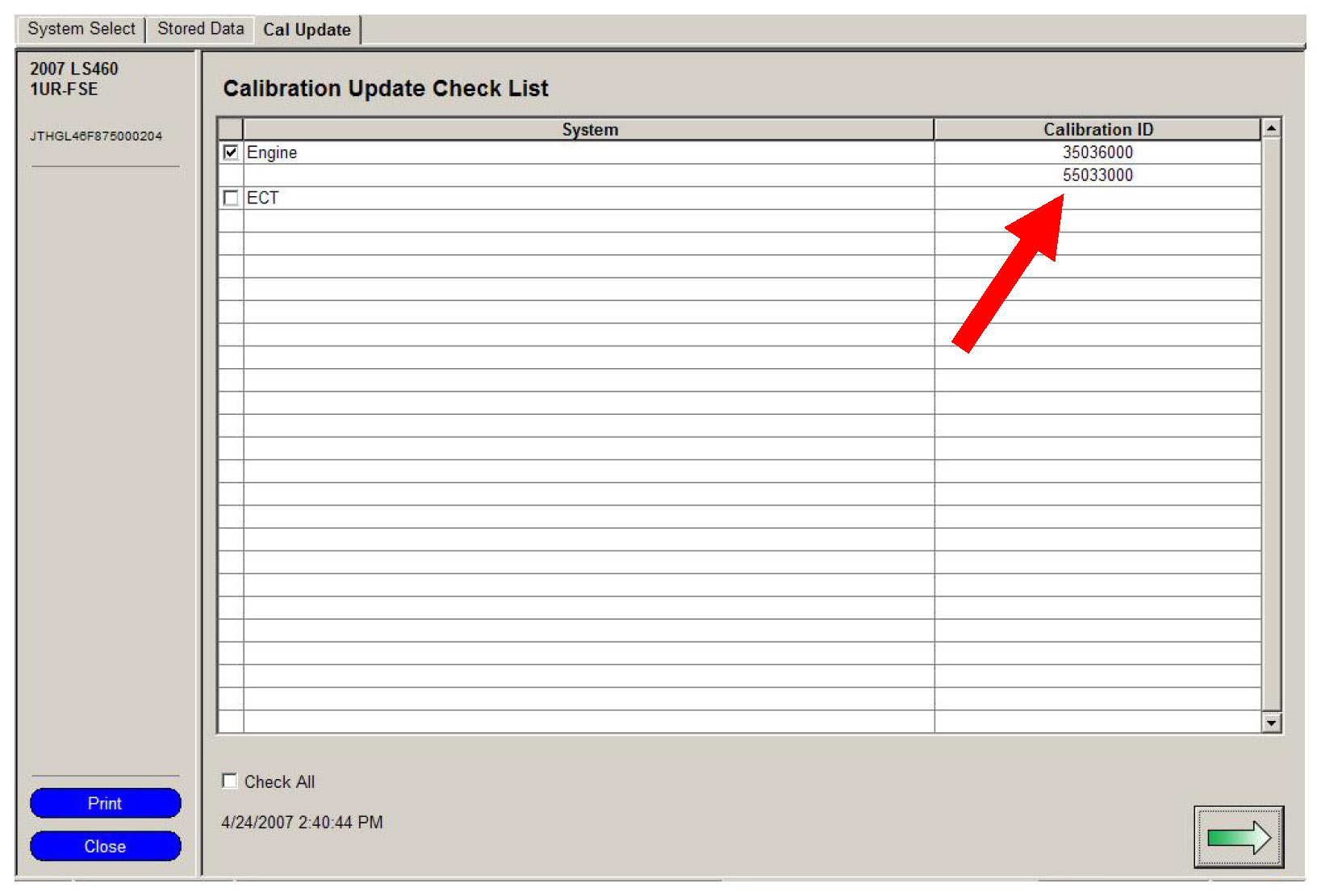 3. Locate the appropriate calibration ID and reprogram the vehicle's ECU with Techstream.