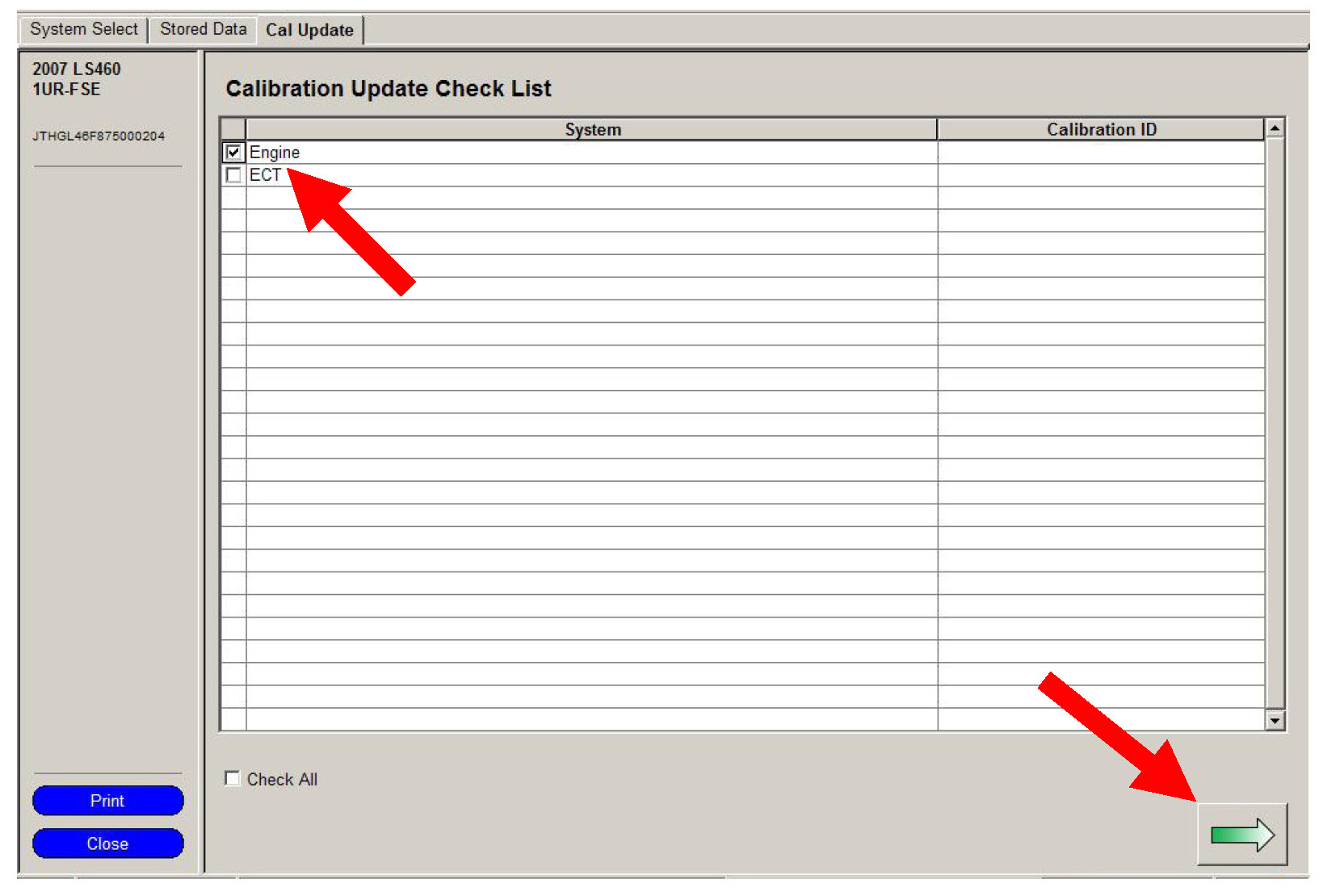 1. Verify the vehicle's applicability for recalibration and locate desired calibration file. Vehicle applicability/calibration ID #'s can be determined by the following methods: