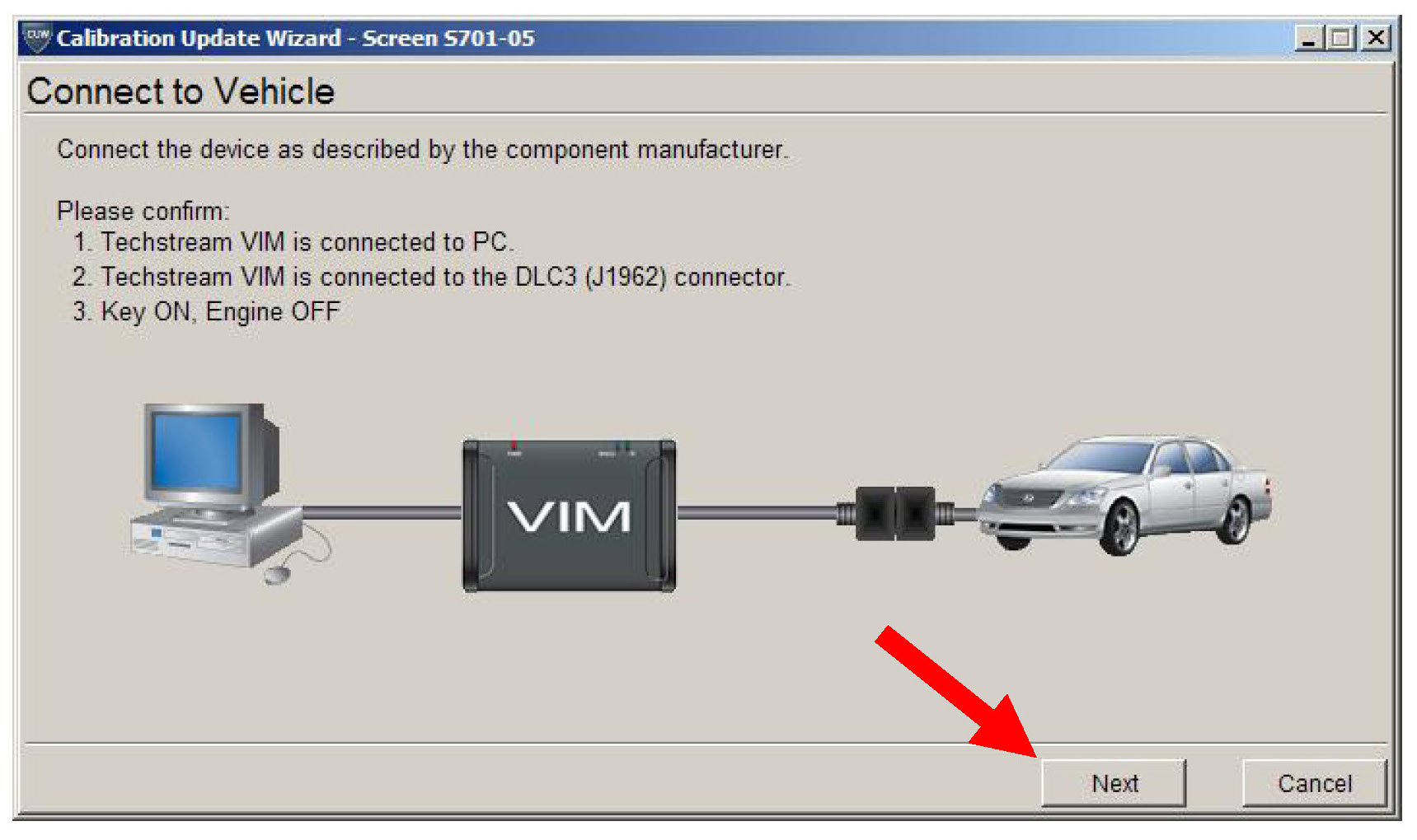 C. Select Techstream VIM as the desired programming device. Then click Next.