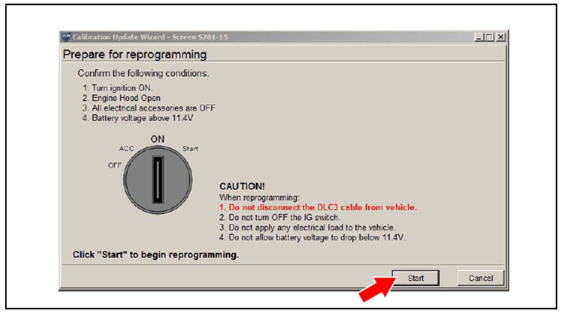 - Battery voltage MUST NOT FALL BELOW 11.4 volts during reprogramming. Confirm battery voltage is higher than 11.4 volts, but be sure voltage DOES NOT RISE ABOVE 16.0 volts during reprogramming.