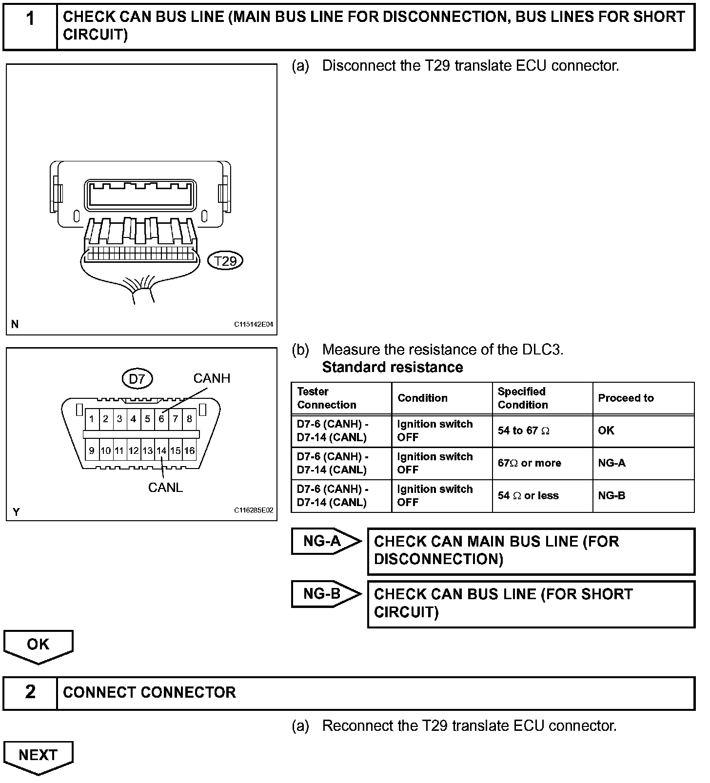 When any DTC for the CAN communication system is output, first measure the resistance between the terminals of the DLC3 to specify the trouble area, and check that there is no short in the CAN main bus line, between the CAN bus lines, to B+, or to GND.