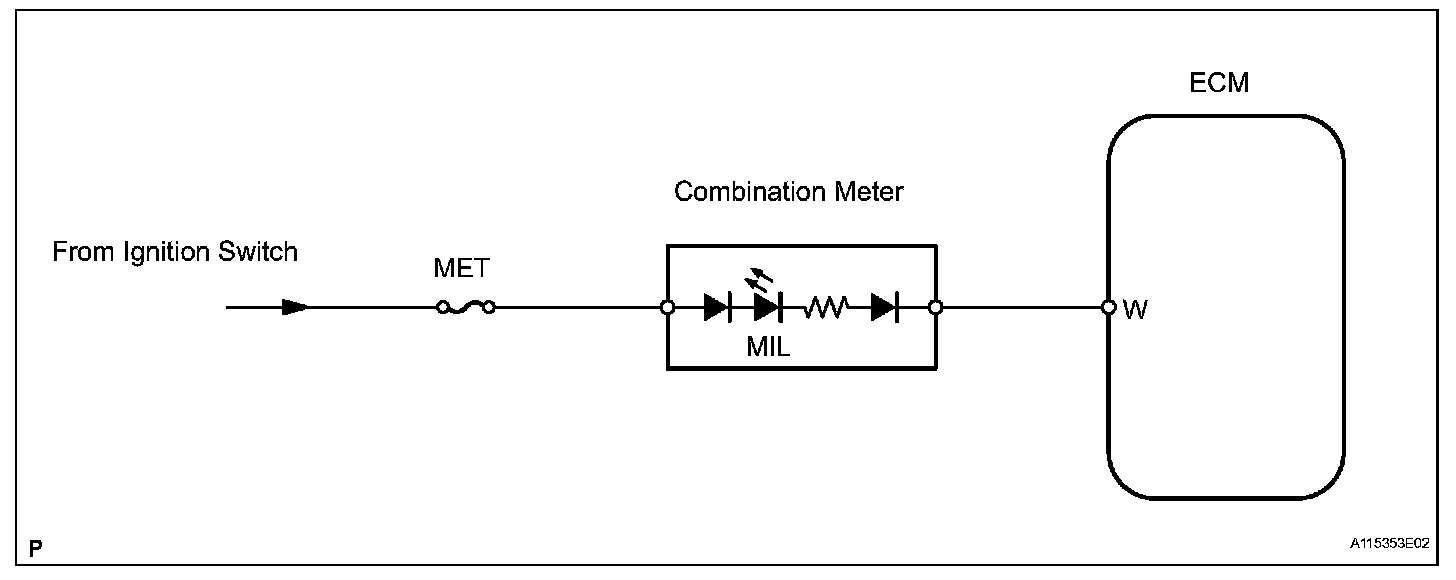 The Malfunction Indicator Lamp (MIL) is used to indicate the ECM's detection of a vehicle malfunction. The instrument panel MET fuse provides the circuit with power and the ECM provides the circuit ground that illuminates the MIL.