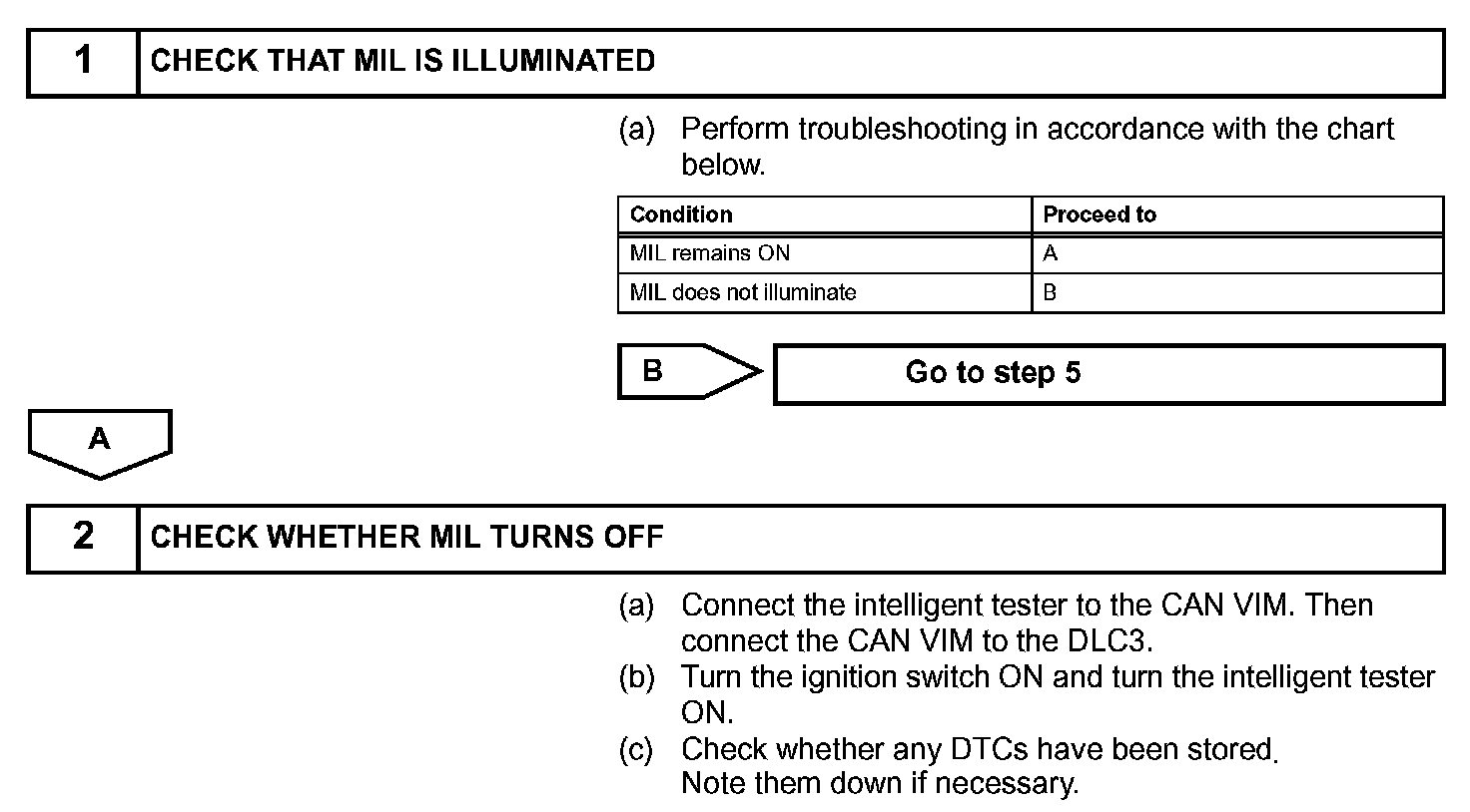 The MIL should be illuminated when the ignition switch is turned ON. If the MIL is always ON or OFF, use the intelligent tester and follow the procedures to determine the cause of the problem.