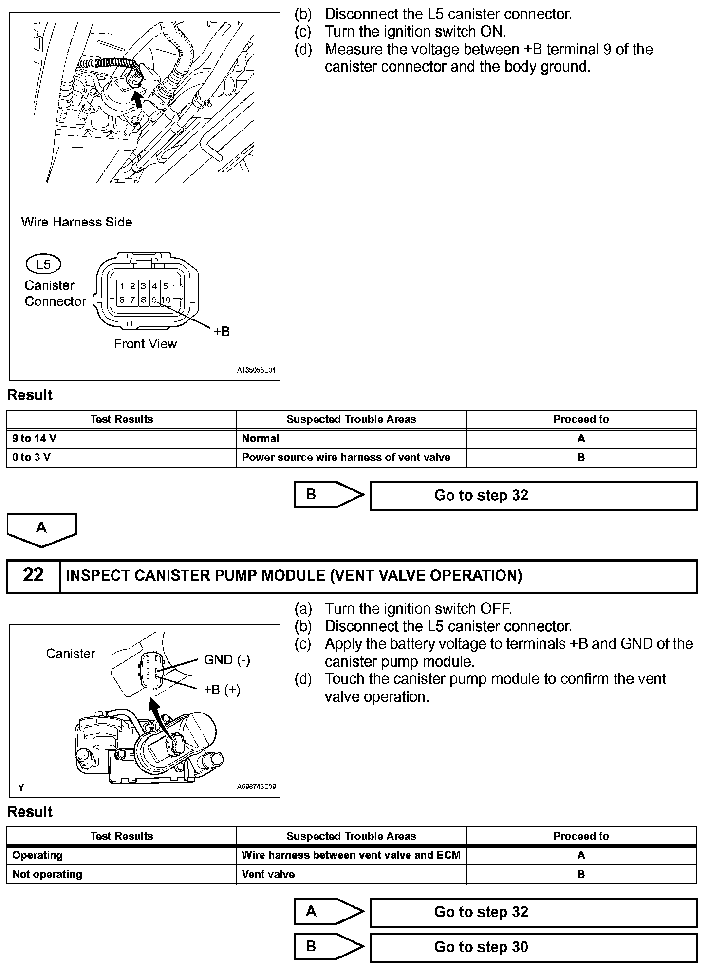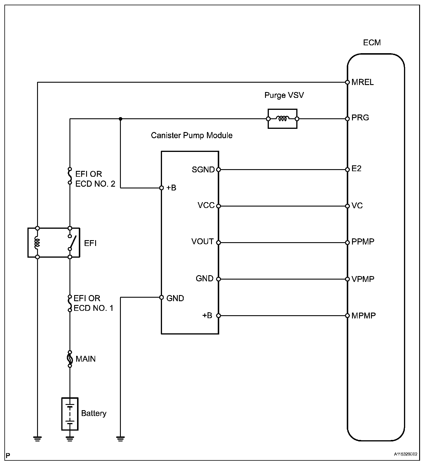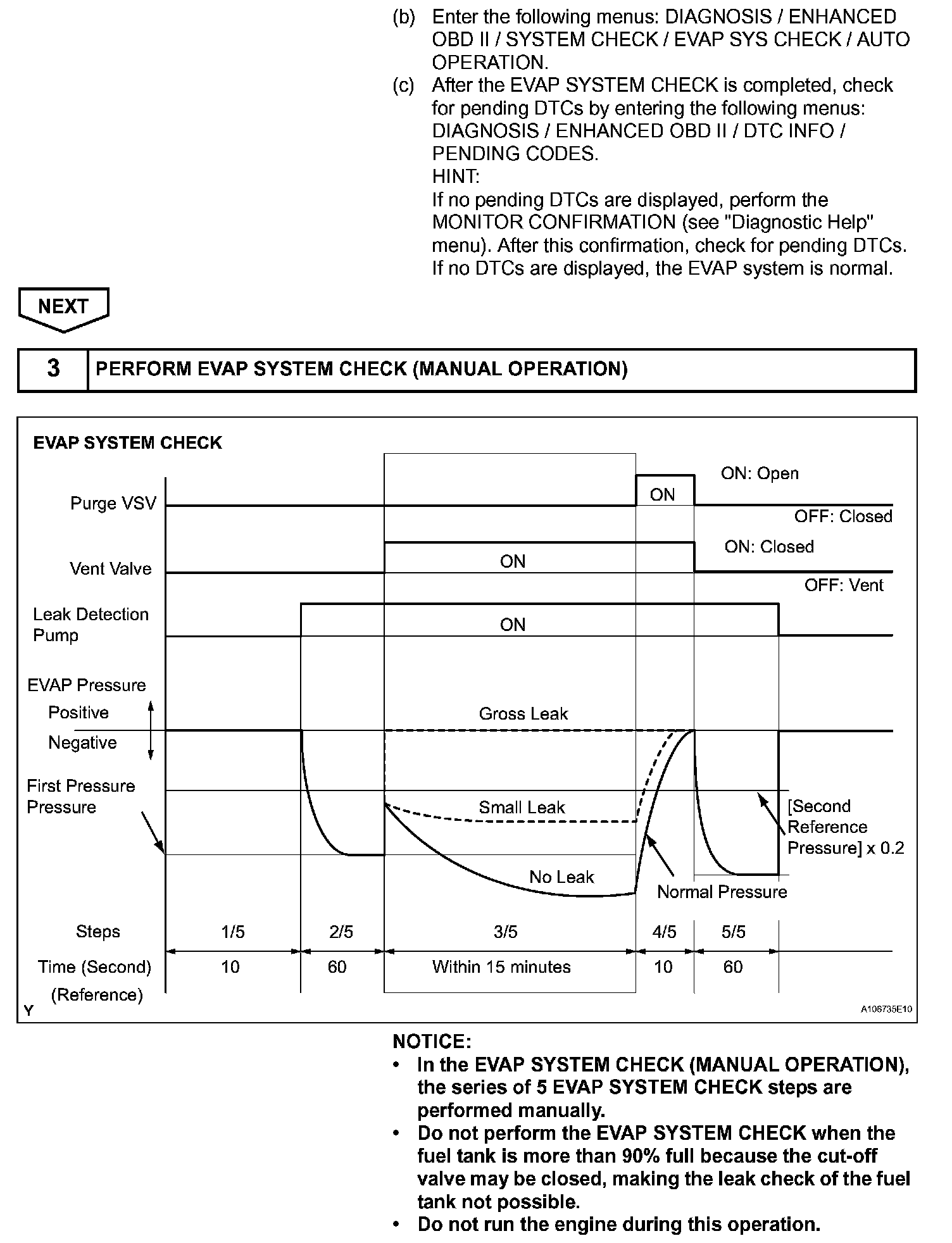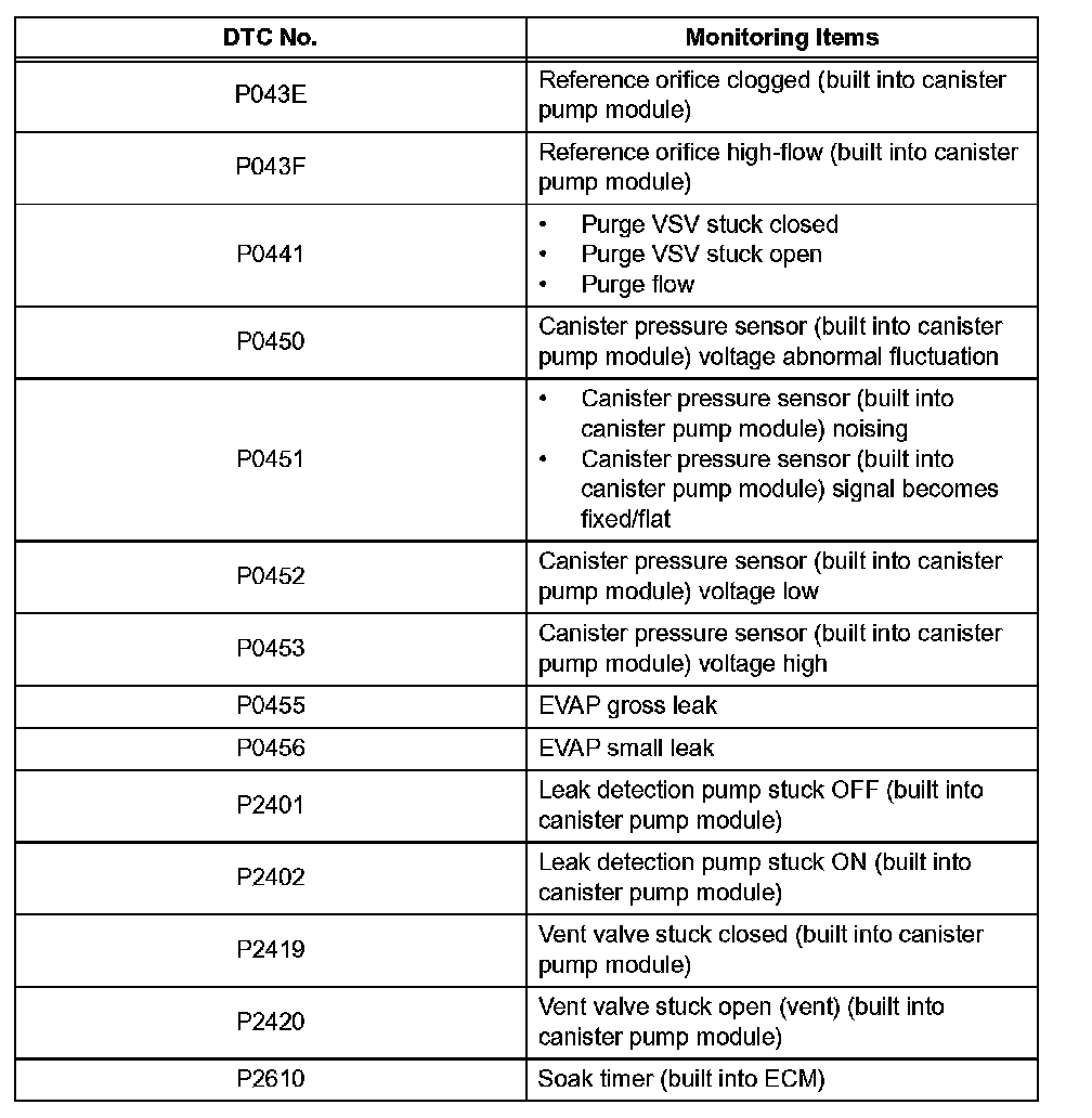 The leak detection pump creates negative pressure (vacuum) in the EVAP system and the pressure is measured. Finally, the ECM monitors for leaks from the EVAP system and malfunctions in both the canister pump module and purge VSV, based on the EVAP pressure.