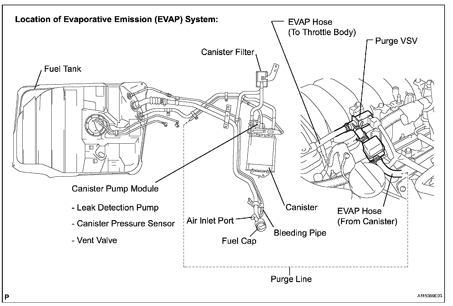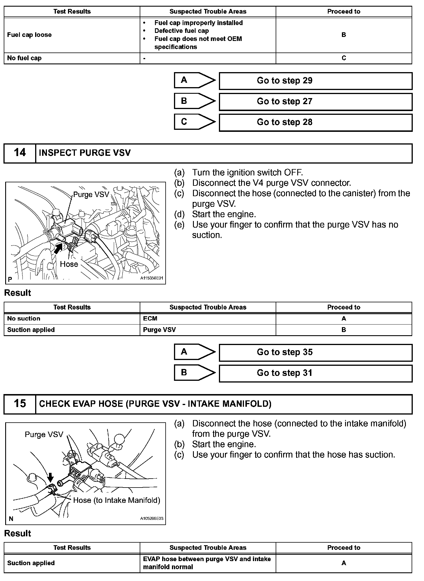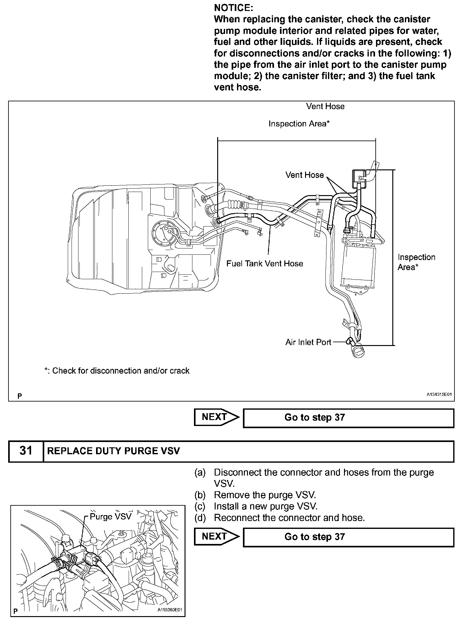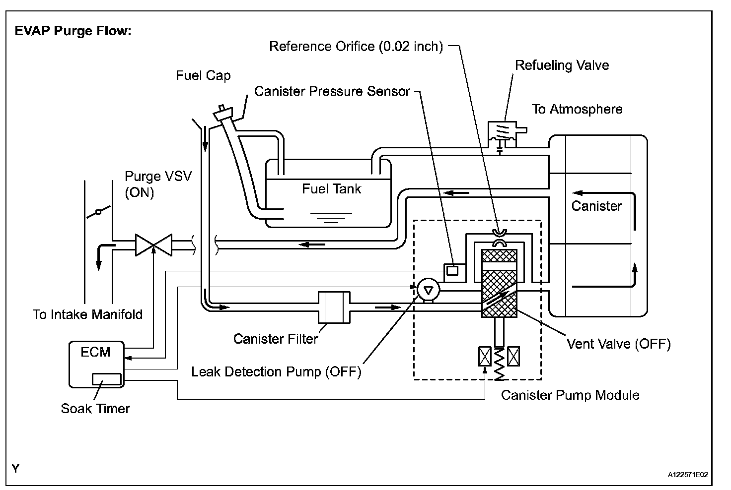 While the engine is running, if a predetermined condition (closed-loop etc.) is met, the purge VSV is opened by the ECM and stored fuel vapors in the canister are purged to the intake manifold. The ECM changes the duty cycle ratio of the purge VSV to control purge flow volume.