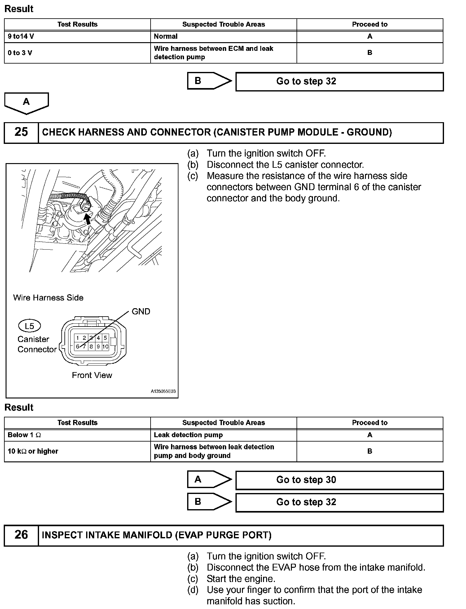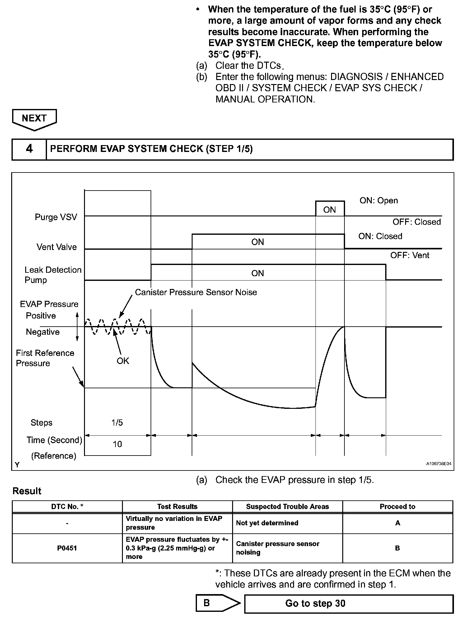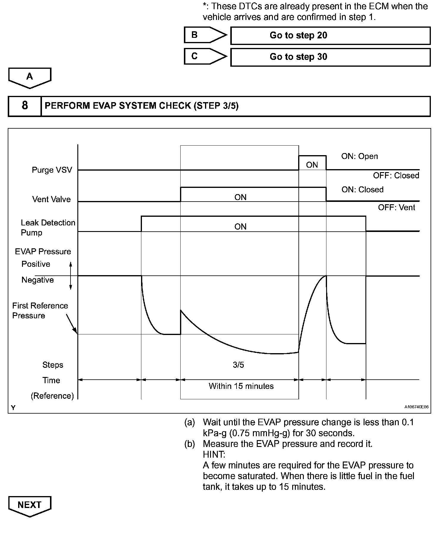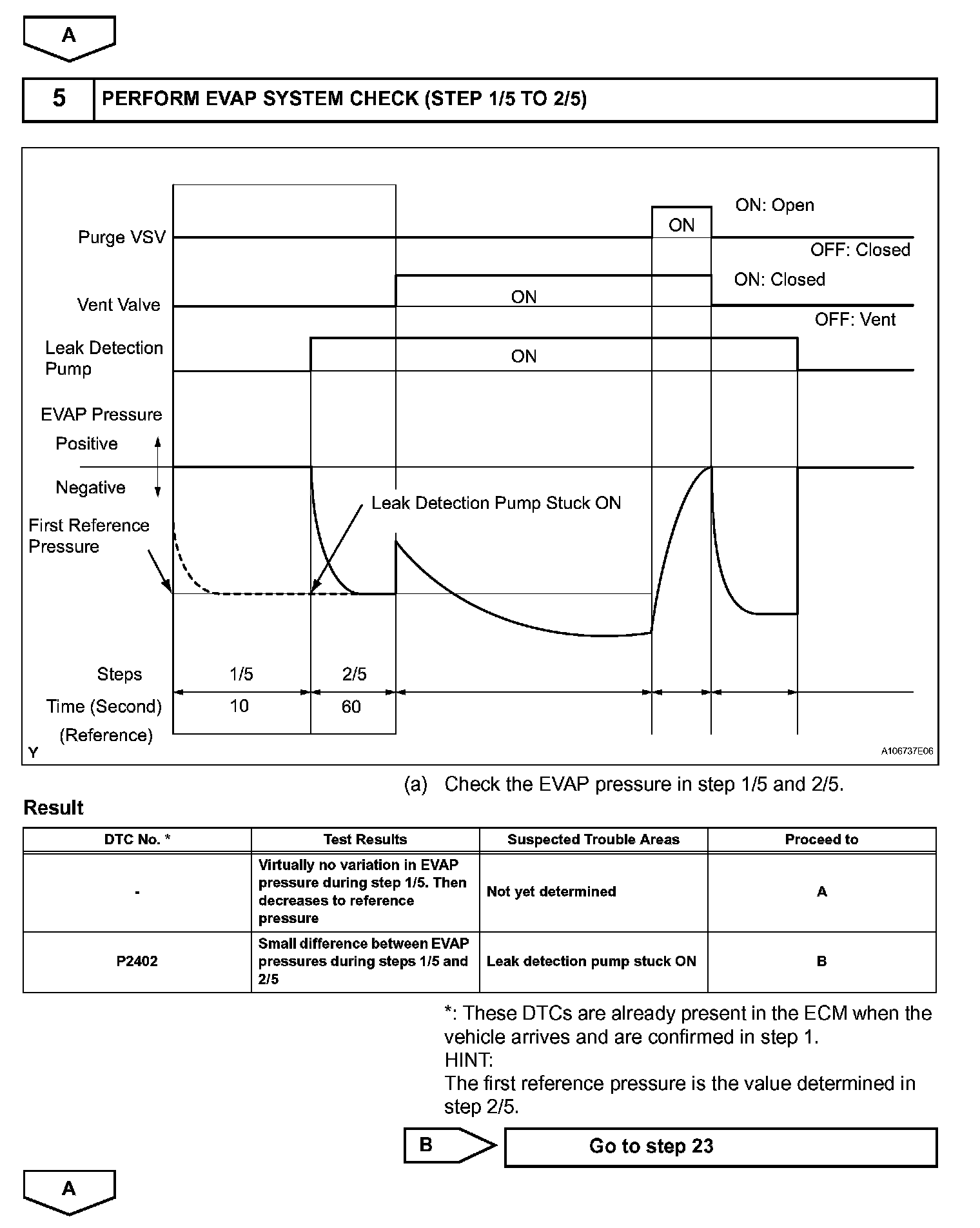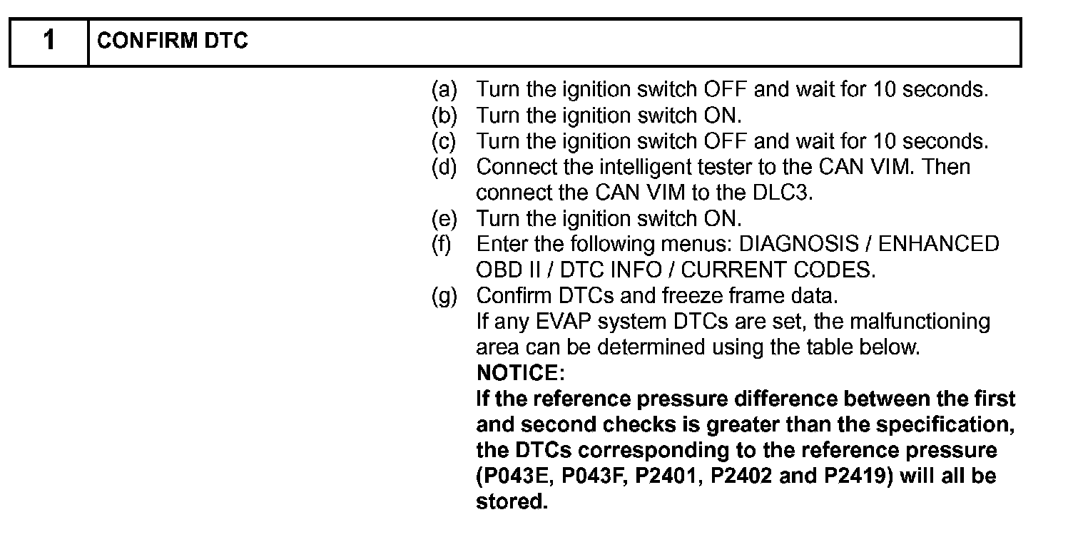 NOTE: If the reference pressure difference between the first and second checks is greater than the specification, the DTCs corresponding to the reference pressure (P043E, P043F, P2401, P2402 and P2419) will all be stored.