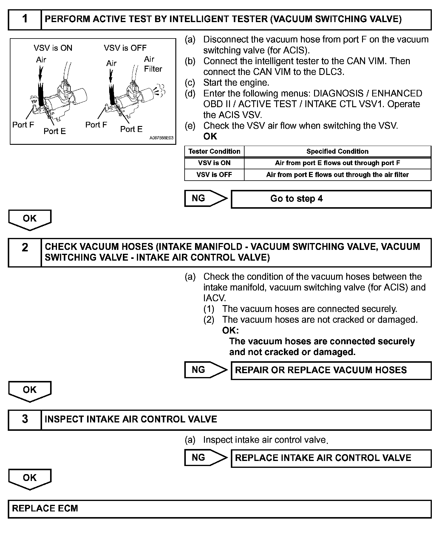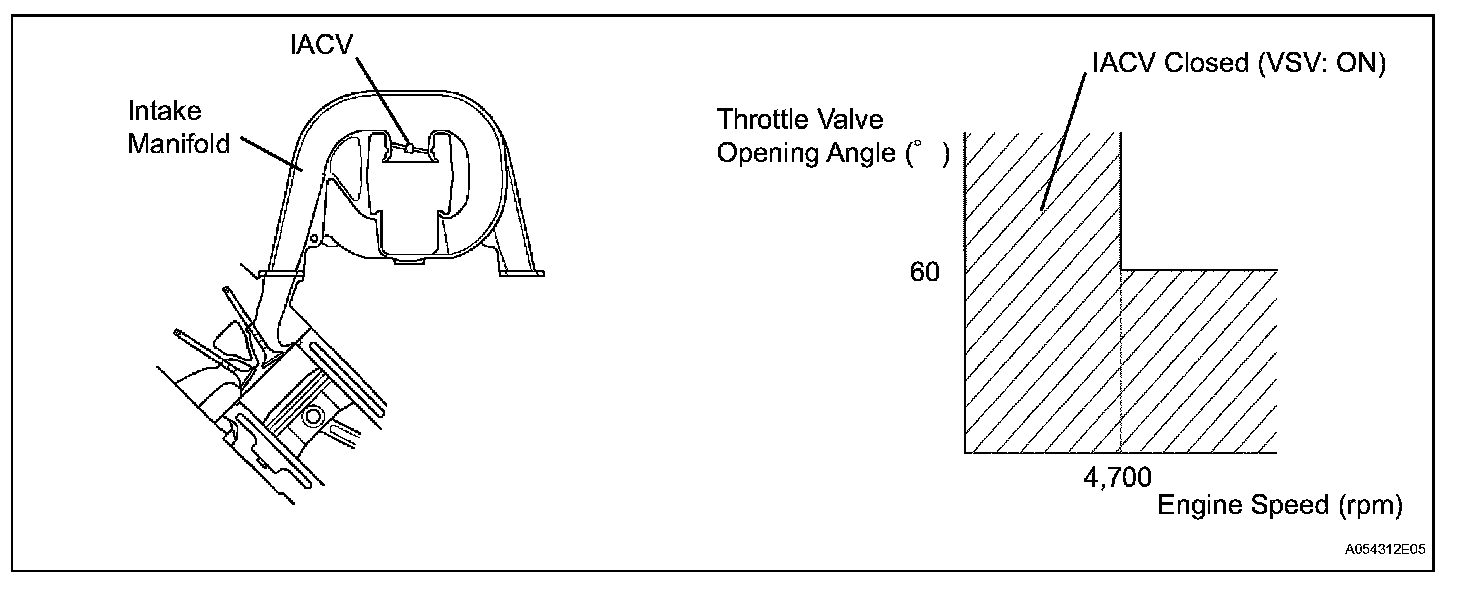 When the engine speed is 4,700 rpm or more and the throttle valve opening angle is 60° or more, the IACV is open (VSV: OFF). At all other times, the IACV is closed (VSV: ON).