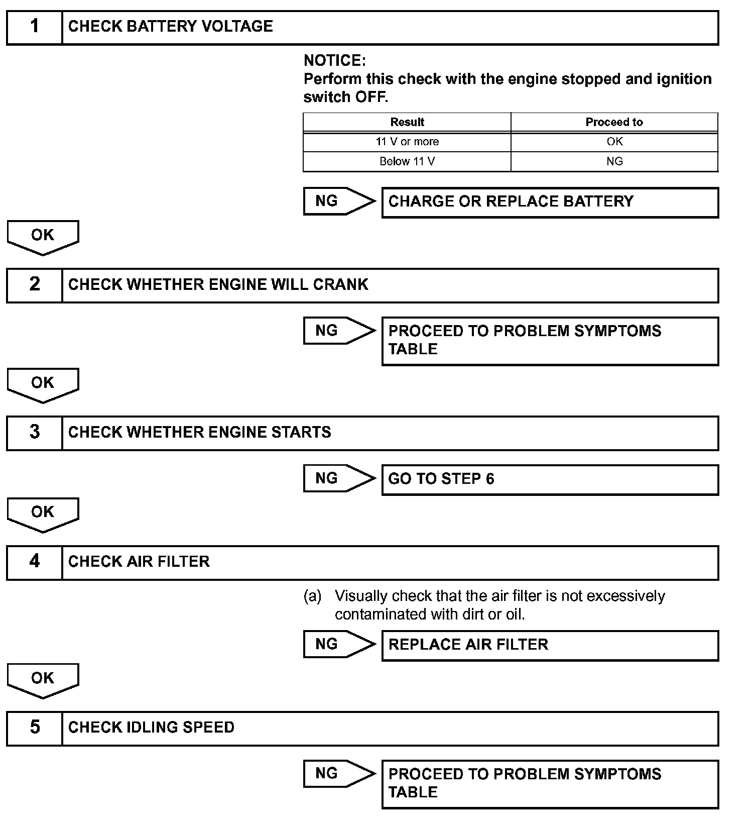 When the malfunction is not confirmed by the DTC check, troubleshooting should be carried out in all circuits considered to be possible causes of the problem. In many cases, by carrying out the basic engine check shown in the given flowchart, the location of the problem can be found quickly and efficiently. Therefore, using this check is essential when engine troubleshooting.