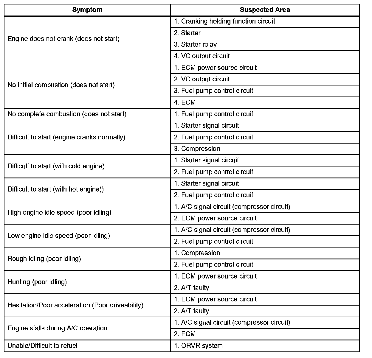 HINT: Use the to help determine the cause of the problem symptom. The potential causes of the symptoms are listed in order of probability in the "Suspected Area" column of the table. Check each symptom by checking the suspected areas in the order they are listed. Replace parts as necessary.