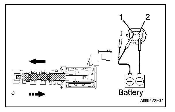 b. Connect the battery's positive (+) lead to terminal 1 and negative (-) lead to terminal 2, and check the movement of the valve.