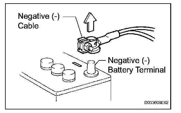 1. Before performing electronic work, disconnect the cable from the negative (-) battery terminal to prevent component and wire damage caused by accidental short circuits.
