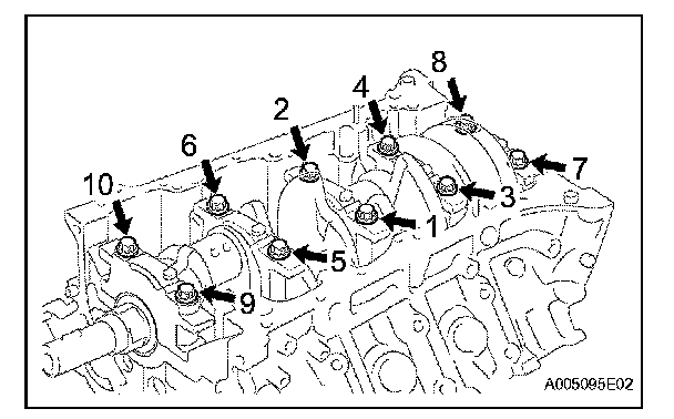 Install and uniformly tighten the 10 crankshaft bearing cap bolts in several passes in the sequence shown in the illustration.