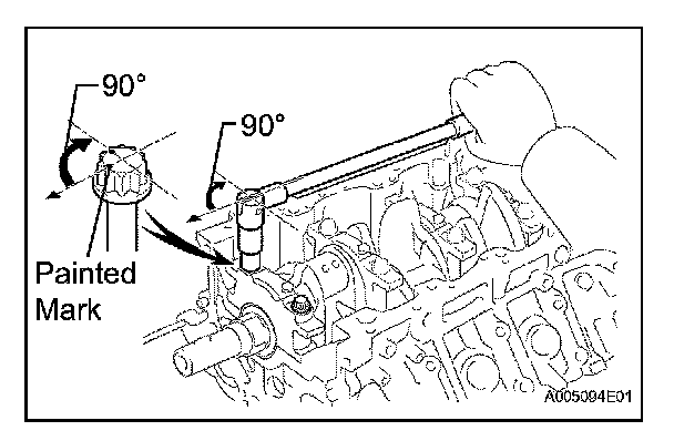 Tighten the crankshaft bearing cap bolts another 90° as shown in the illustration.