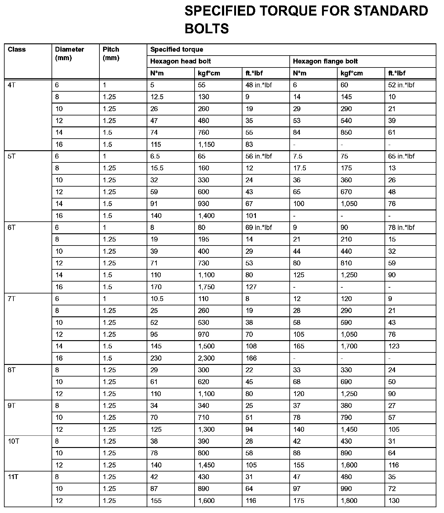 Standard Bolt - Specified Torque For Standard Bolts: