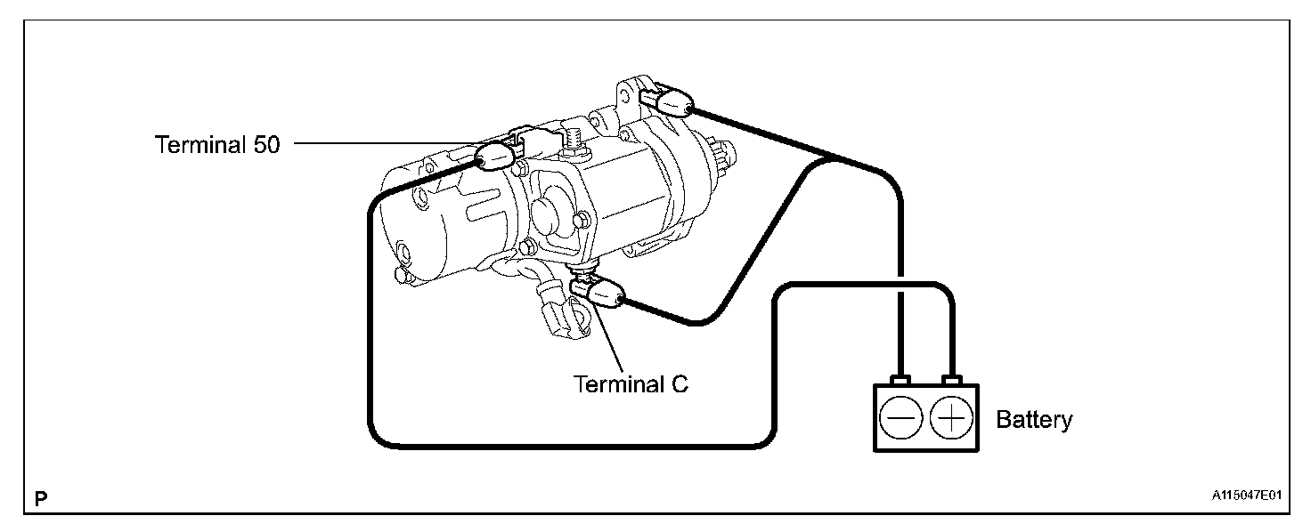 3. Disconnect the negative (-) lead from terminal C. Check that the pinion gear remains out.