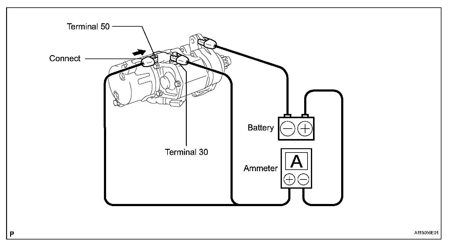 3. Connect the battery and ammeter to the starter as shown in the illustration.