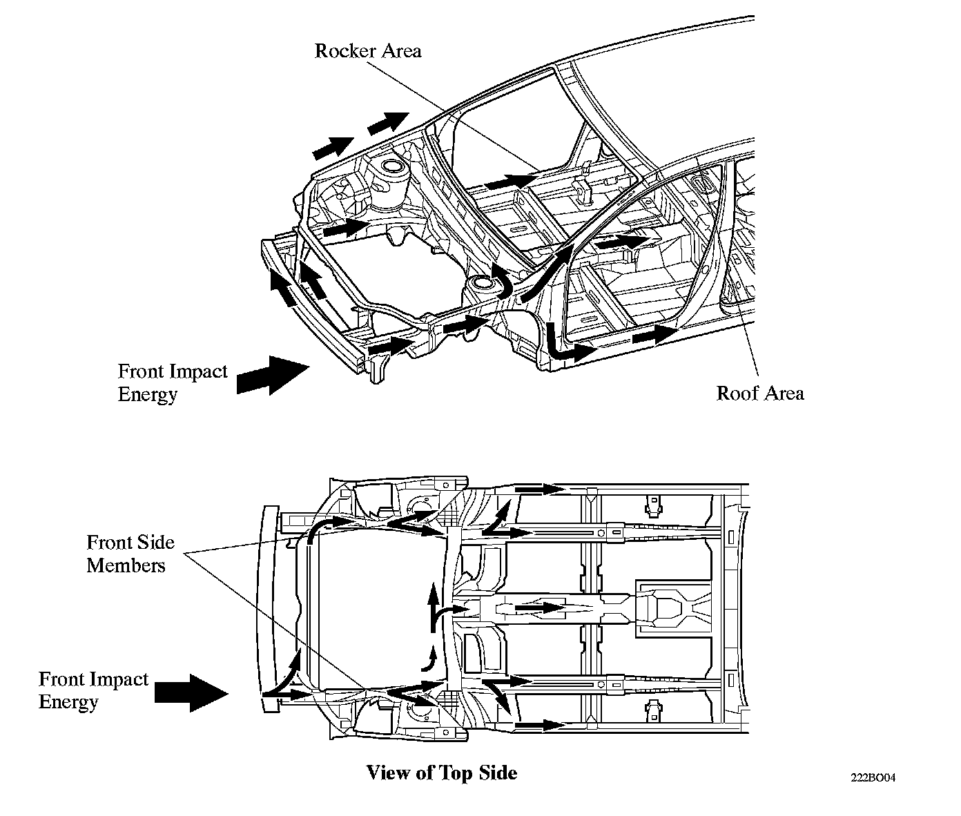 ^ Differential-thickness sheet metal is used at the front end of the front side members. The thinner front portion and the thicker rear portion enable the front end of the side members to collapse efficiently in order to effectively absorb the impact energy.