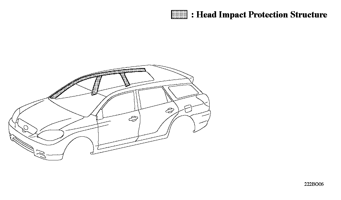 ^ A Head Impact Protection Structure has been adopted. With this type of structure, if the occupant's head hits against the roof side rail and pillar in a collision, the rib of Energy Absorbing Material(Resin) placed between the pillar garnish and the inner pillar panel collapses to help absorb the impact.