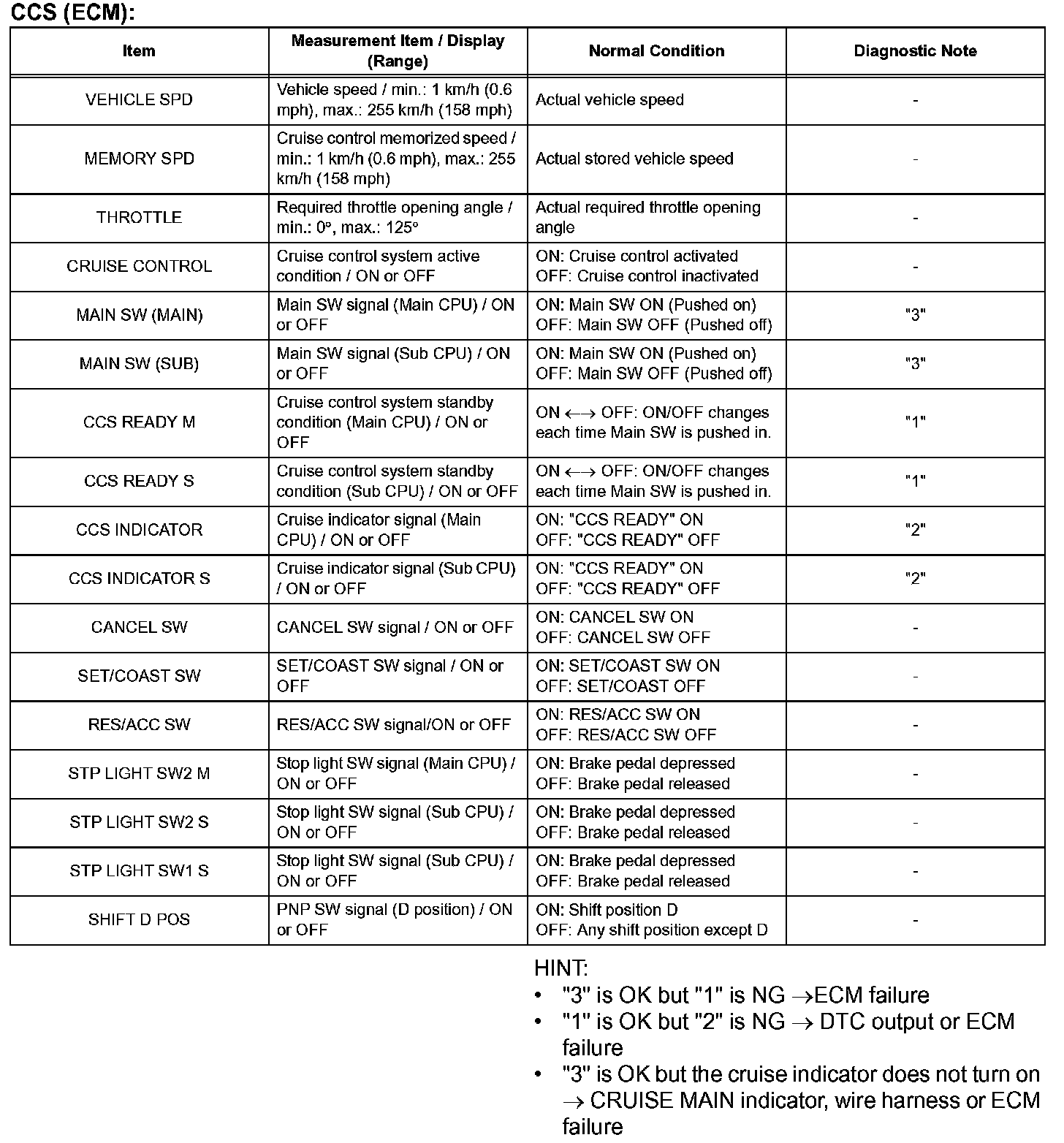 DATA LISTWhile the intelligent tester is connected to the DLC3 with the ignition switch in the ON position, the CRUISE CONTROL data list can be displayed. Follow the prompts on the tester screen to access the data list.