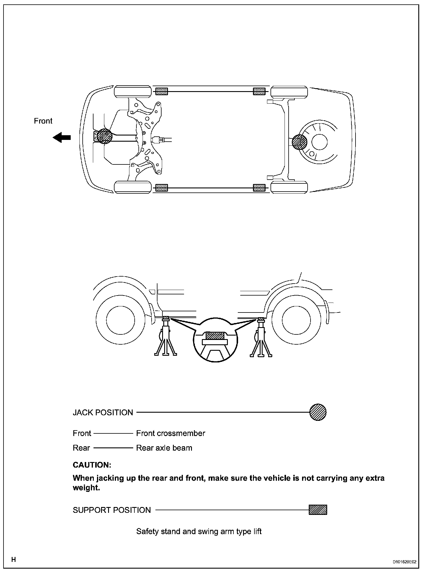 e. Do not work or leave the vehicle supported only by a jack. Be sure to support the vehicle with a safety stand.