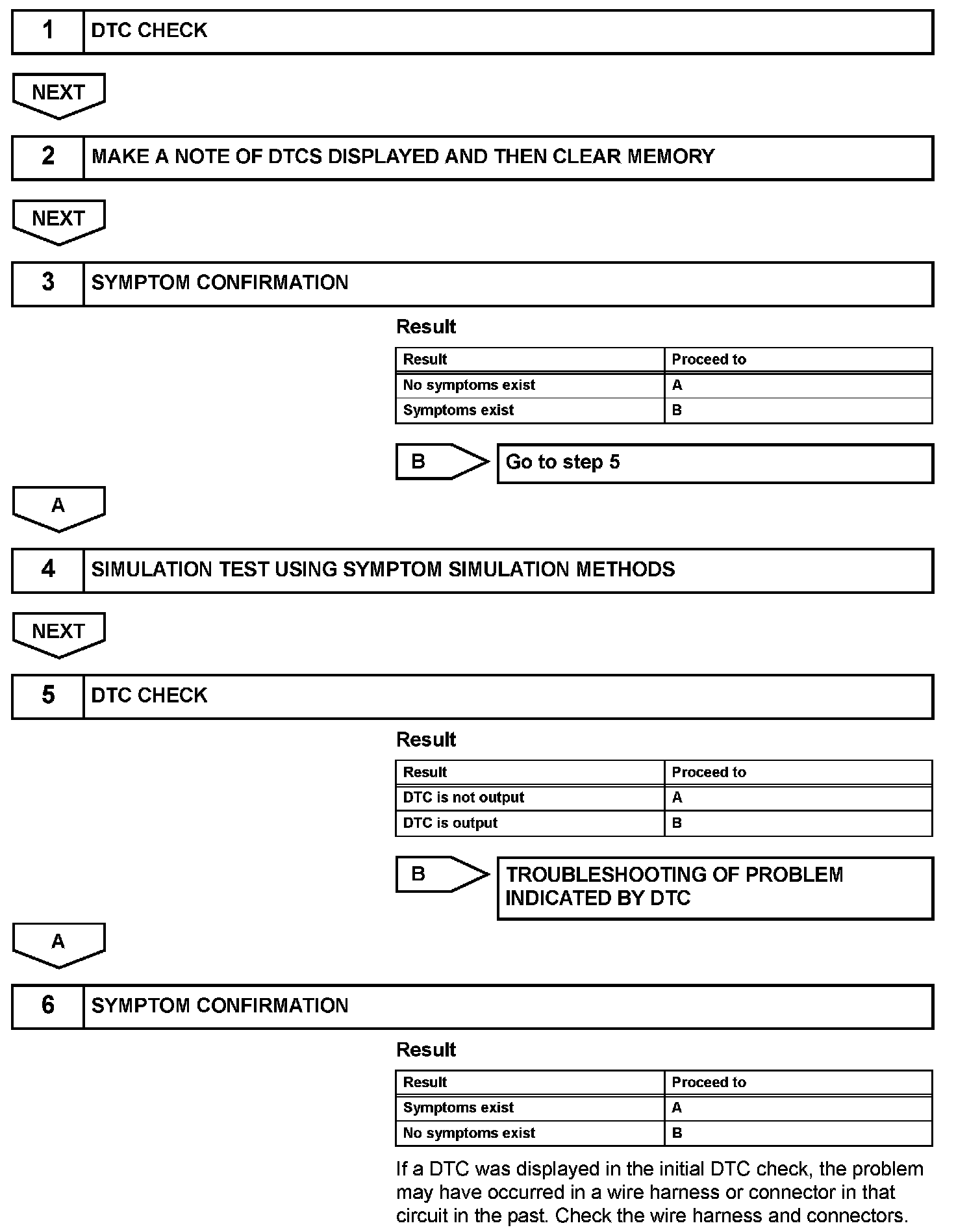 - In the DTC check, it is very important to determine whether the problem indicated by the DTC is either: still occurring, or 2) occurred in the past but has since returned to normal. In addition, the DTC should be compared to the problem symptom to see if they are related. For this reason, DTCs should be checked before and after confirmation of symptoms (i.e., whether or not problem symptoms exist) to determine current system conditions, as shown in the flowchart.