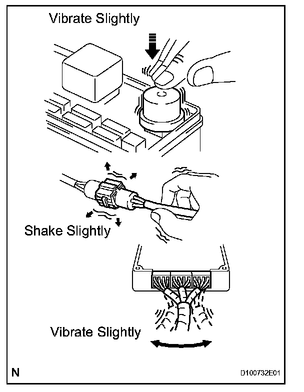 For example: With a problem that only occurs when the engine is cold or as a result of vibration caused by the road during driving, the problem can never be determined if the symptoms are being checked on a stationary vehicle or on a vehicle with a warmed up engine. Vibration, heat or water penetration (moisture) is difficult to reproduce. The symptom simulation tests below are effective substitutes for the conditions and can be applied on a stationary vehicle.