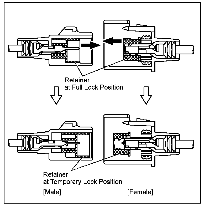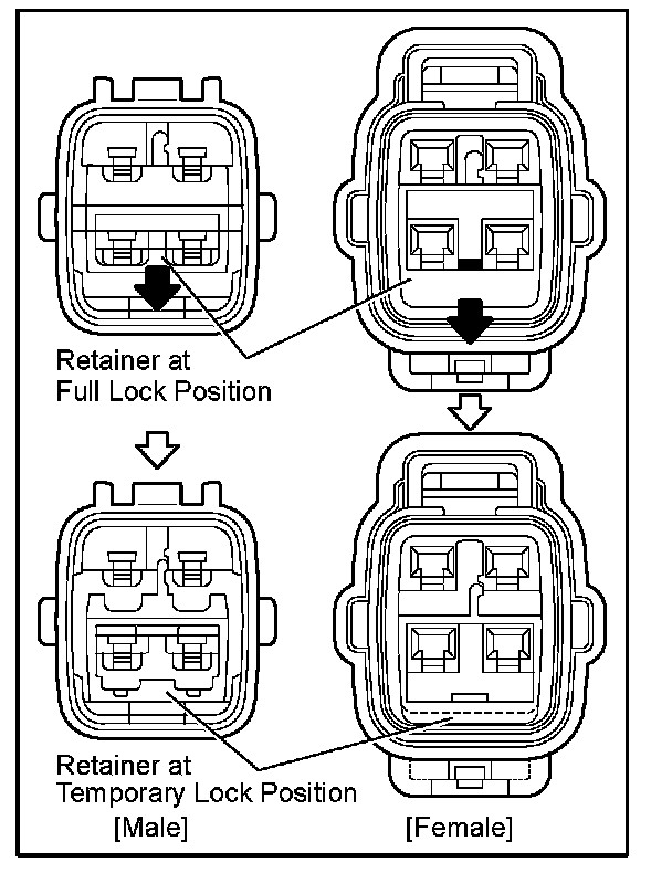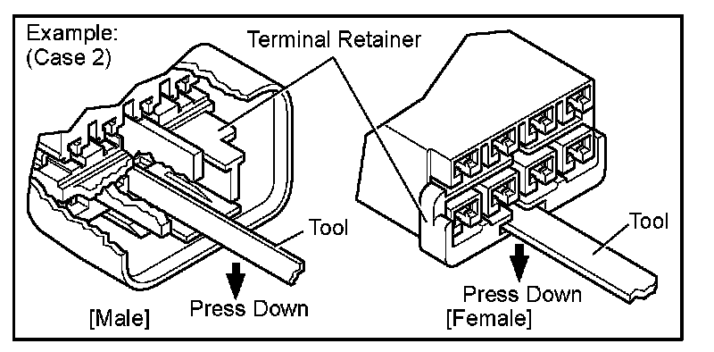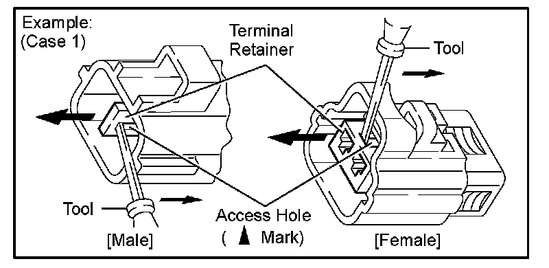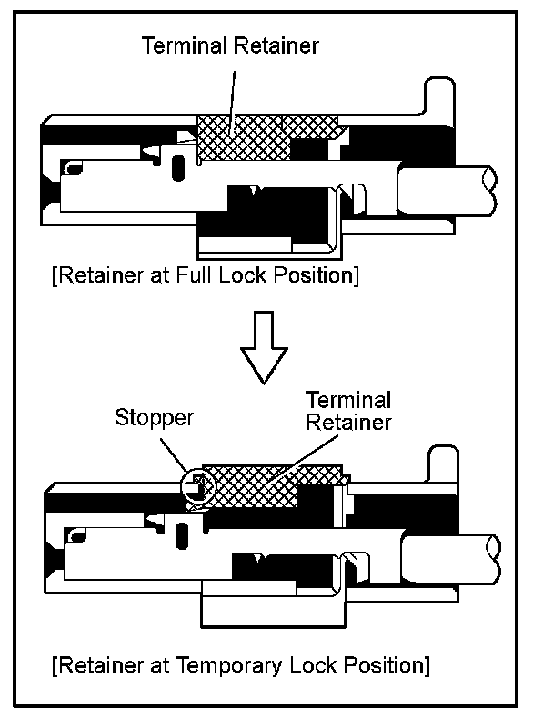 Insert the special tool into the terminal retainer access hole ( Mark) and pull the terminal retainer up to the temporary lock position.