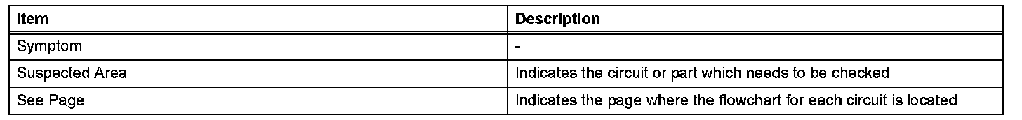 When a "Normal" code is output during a DTC check but the problem is still occurring, use the Problem Symptoms Table. The suspected areas (circuits or parts) for each problem symptom are in the table. The suspected areas are listed in order of probability. A description of each of the chart's columns.