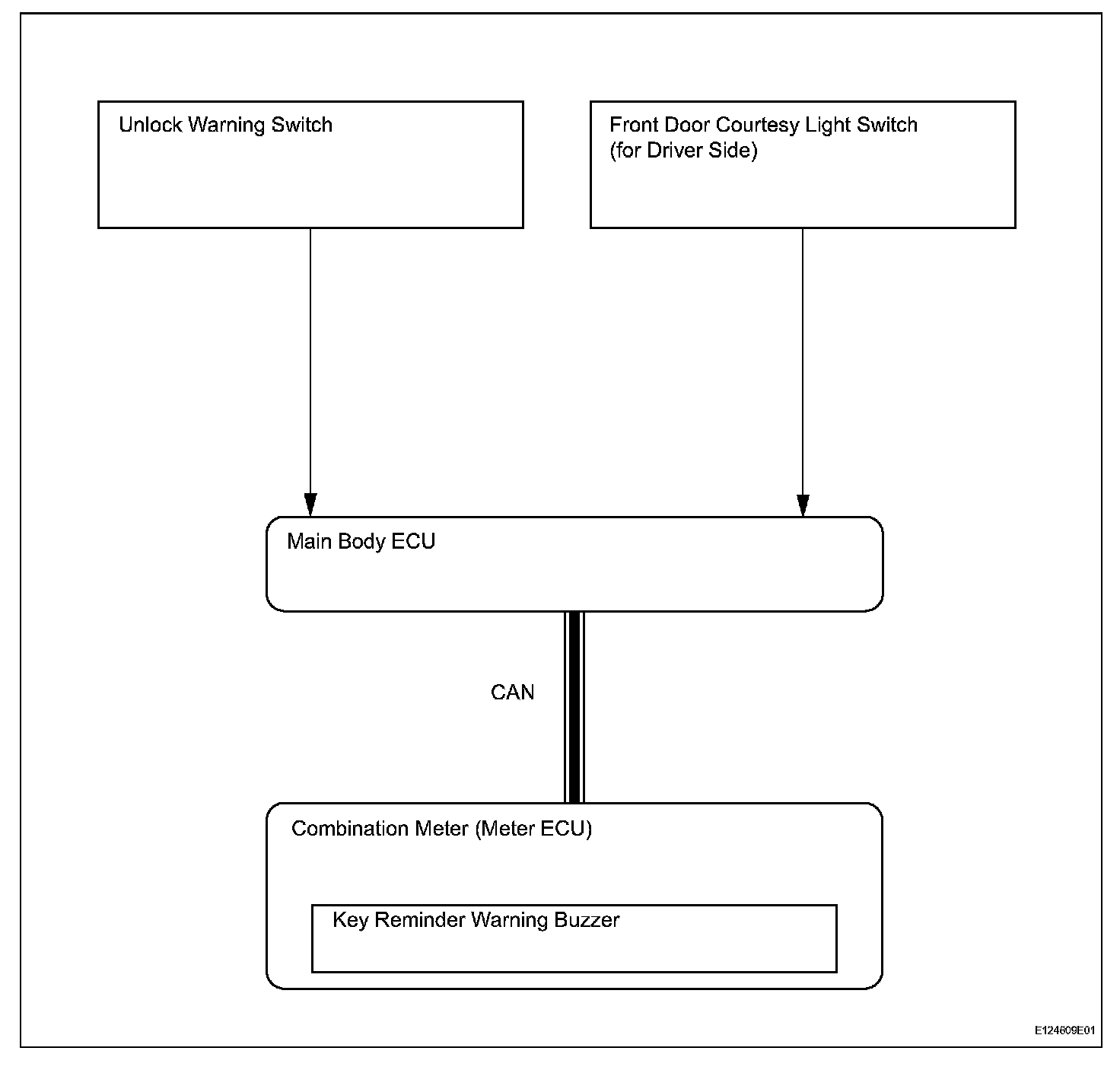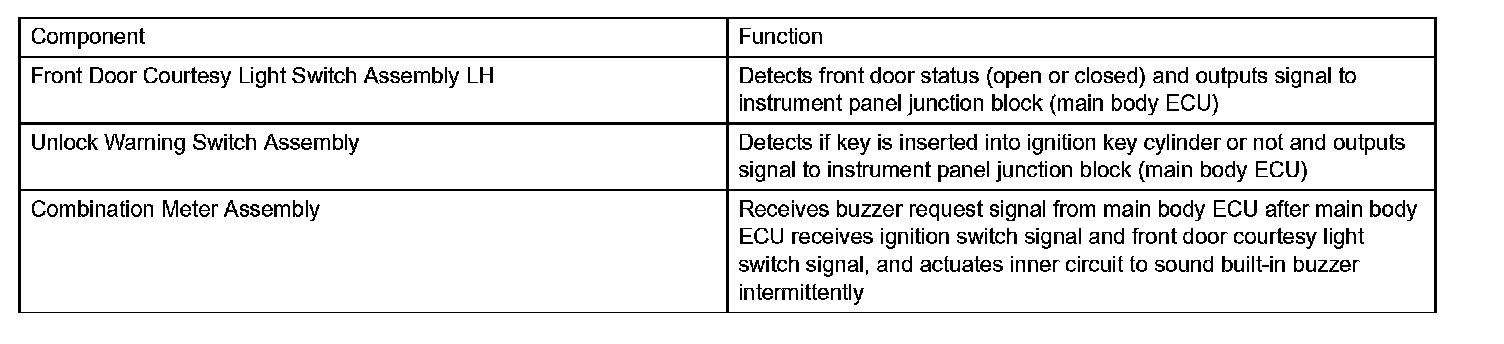 a. When the driver side door is opened with the key in the ignition key cylinder and ignition switch in the ACC or OFF position, this system causes the key reminder warning buzzer to sound in order to warn the driver that the ignition key has not been removed.