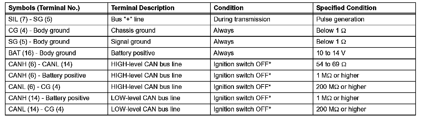 NOTE: *: Before measuring the resistance, leave the vehicle as is for at least 1 minute and do not operate the ignition switch, other switches or doors. If the result is not as specified, the DLC3 may have a malfunction. Repair or replace the harness and connector.