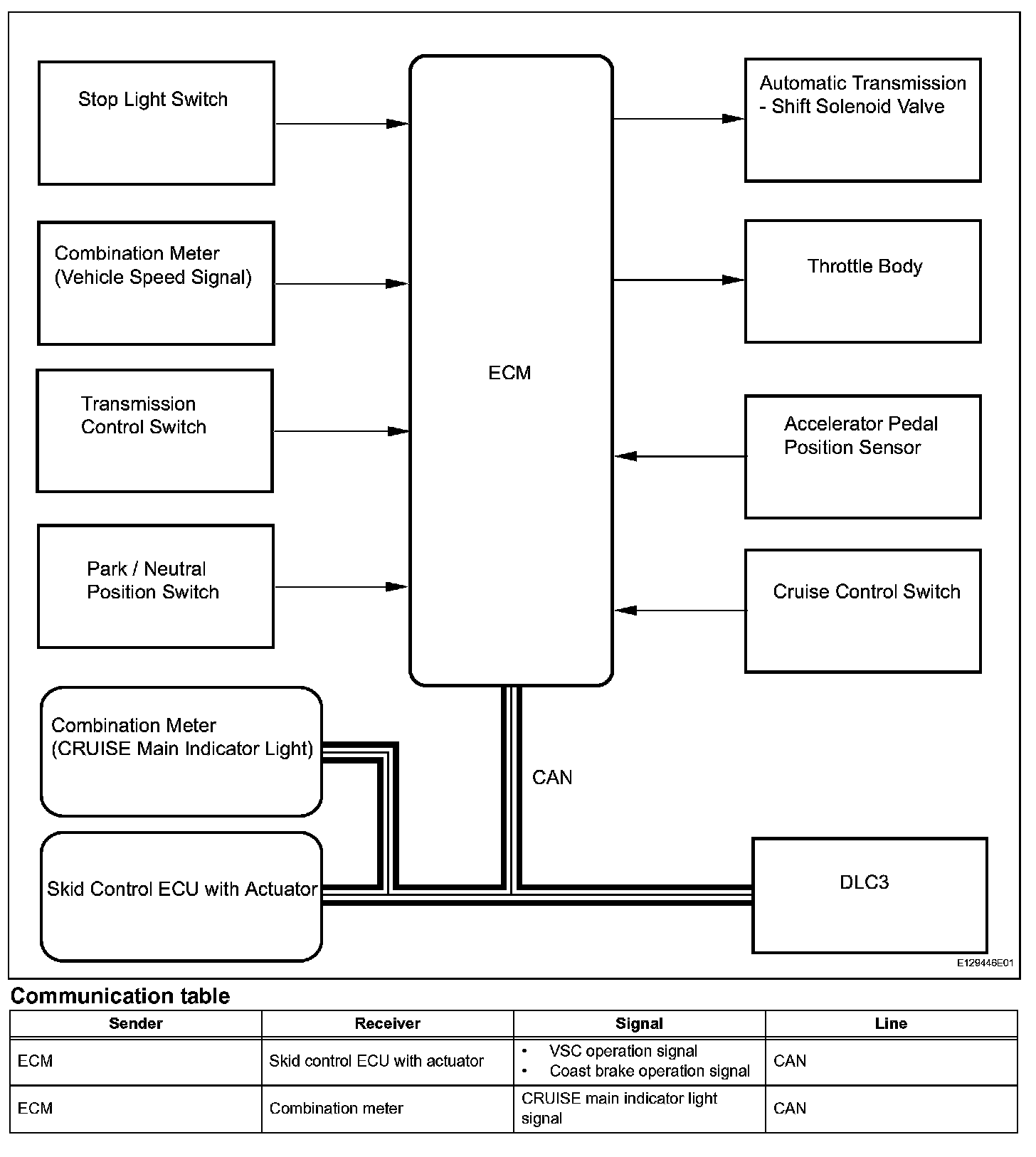 - The ECM receives signals such as ON-OFF, SET / COAST, RESUME / ACCEL, and CANCEL from the cruise control switch.