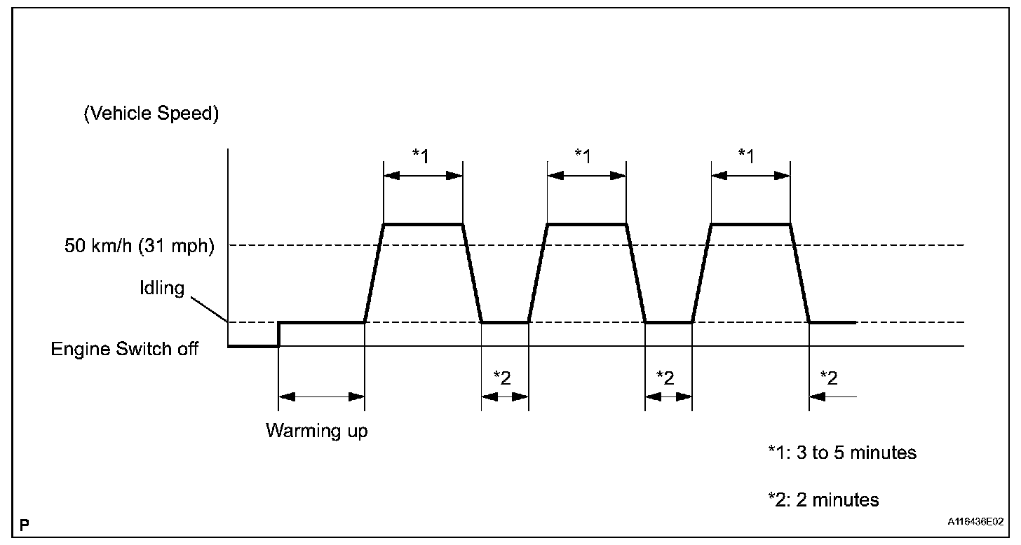6. Drive the vehicle at 50 km/h (31 mph) or more for 3 to 5 minutes*1.