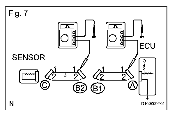 If the results match the examples, a short circuit exists between terminal 1 of connector A and terminal 1 of connector C.