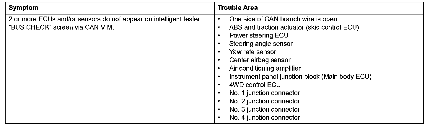 If 2 or more ECUs and/or sensors do not appear on the intelligent tester's "BUS CHECK" screen via the CAN VIM, one side of the CAN branch wire may be open. (One side of the CANH [branch wire]/CANL [branch wire] of the ECU and/or sensor is open.)