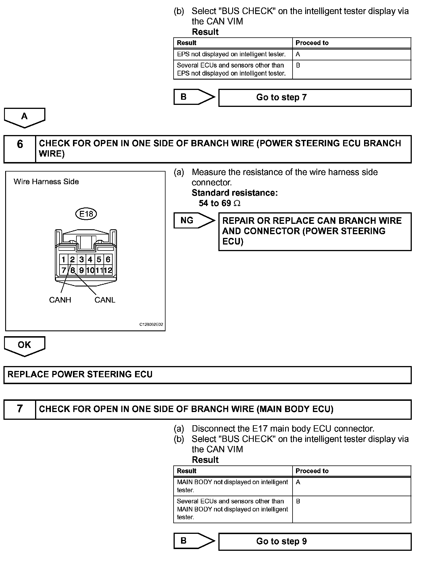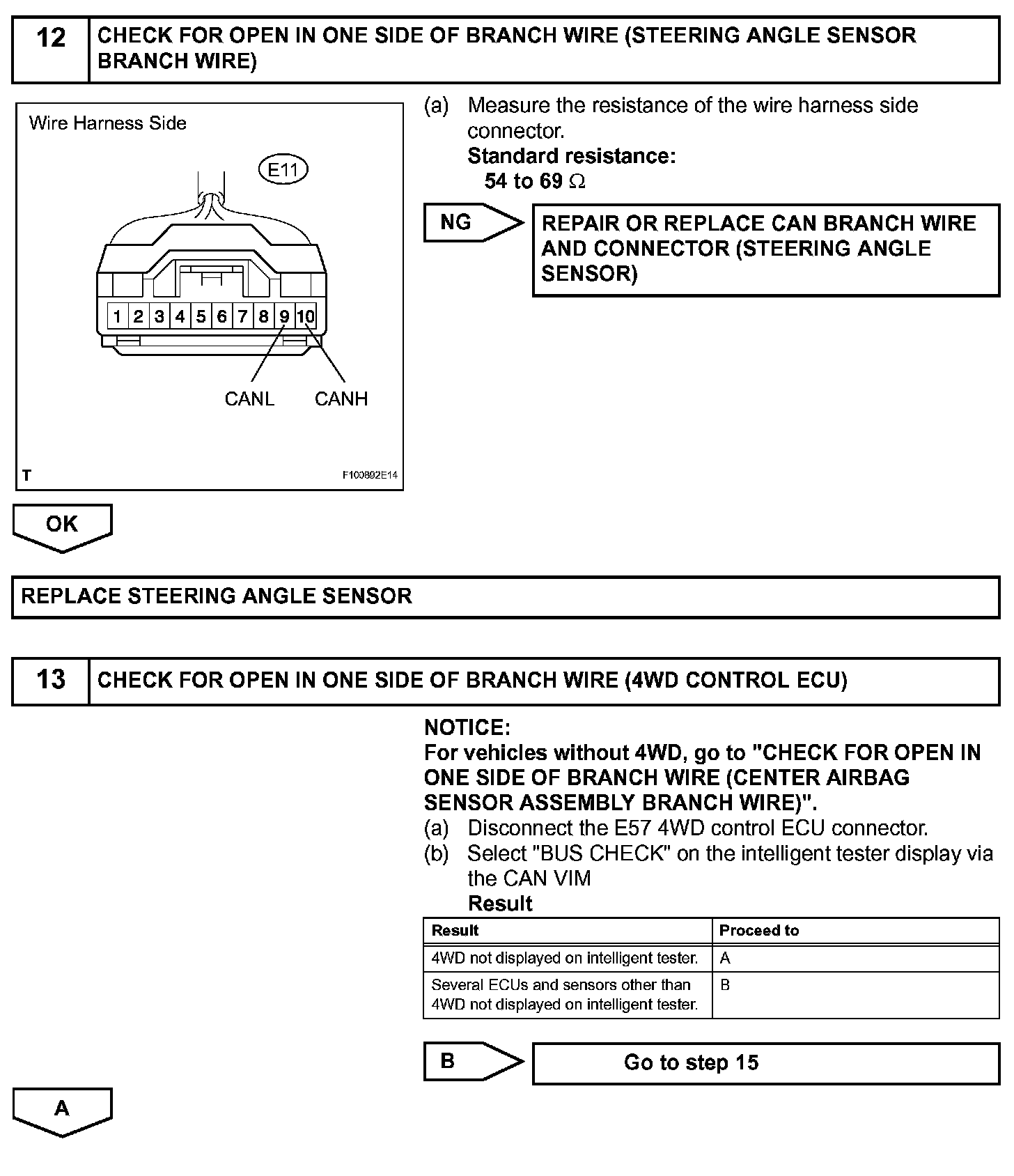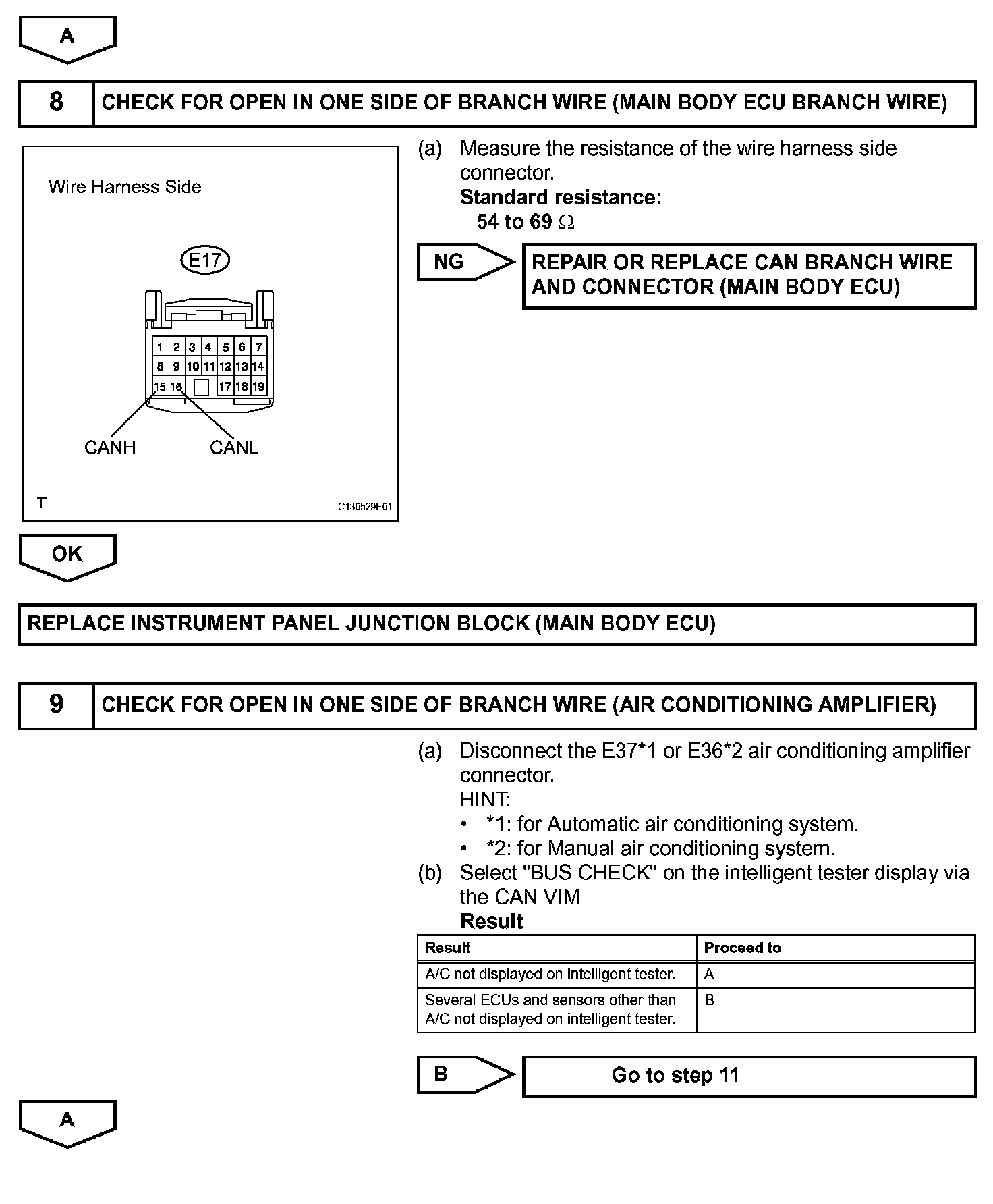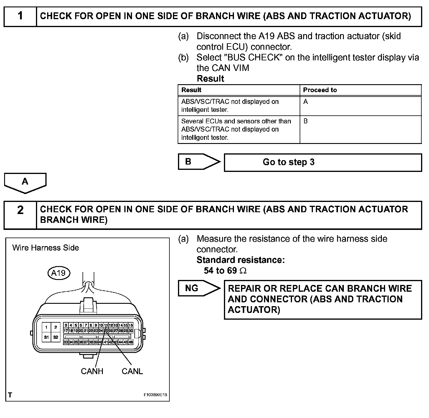 - The open circuit confirmation of the combination meter, ECM and main wire is performed in the CHECK CAN BUS LINE procedure of HOW TO PROCEED WITH TROUBLESHOOTING. This inspection only has procedures for checking for an open circuit on one side of the CAN branch wire.