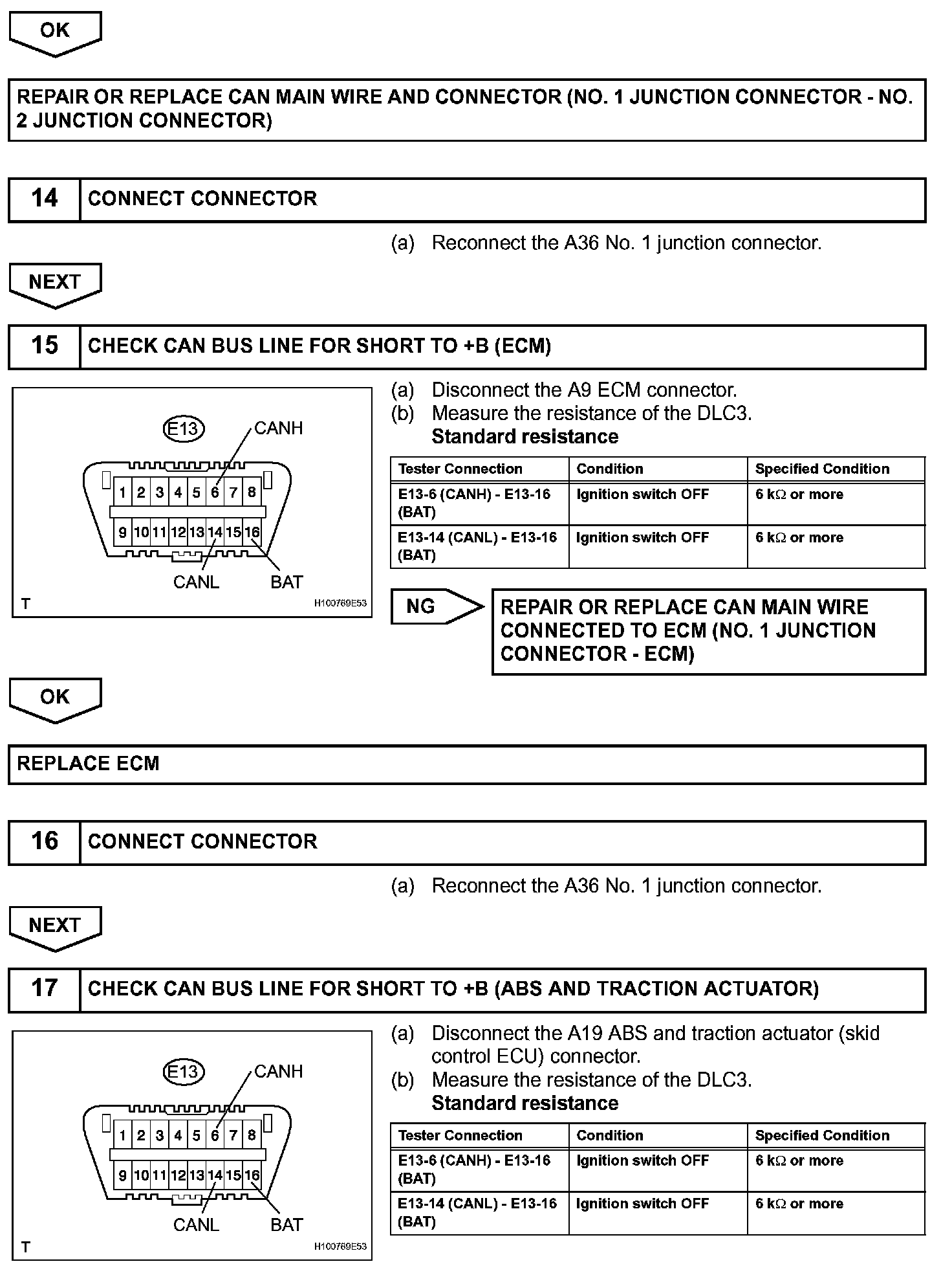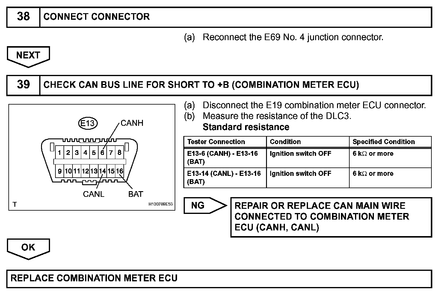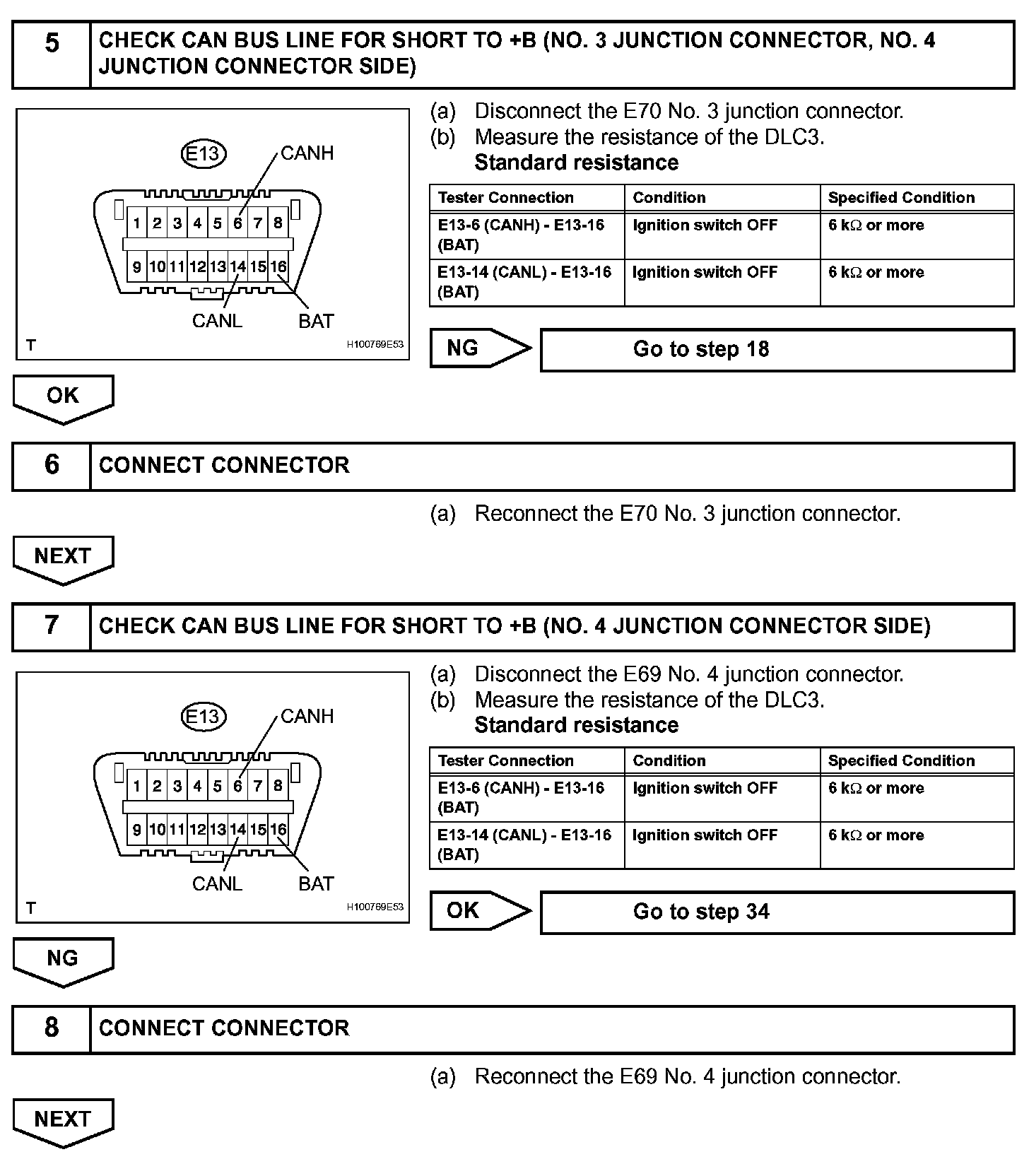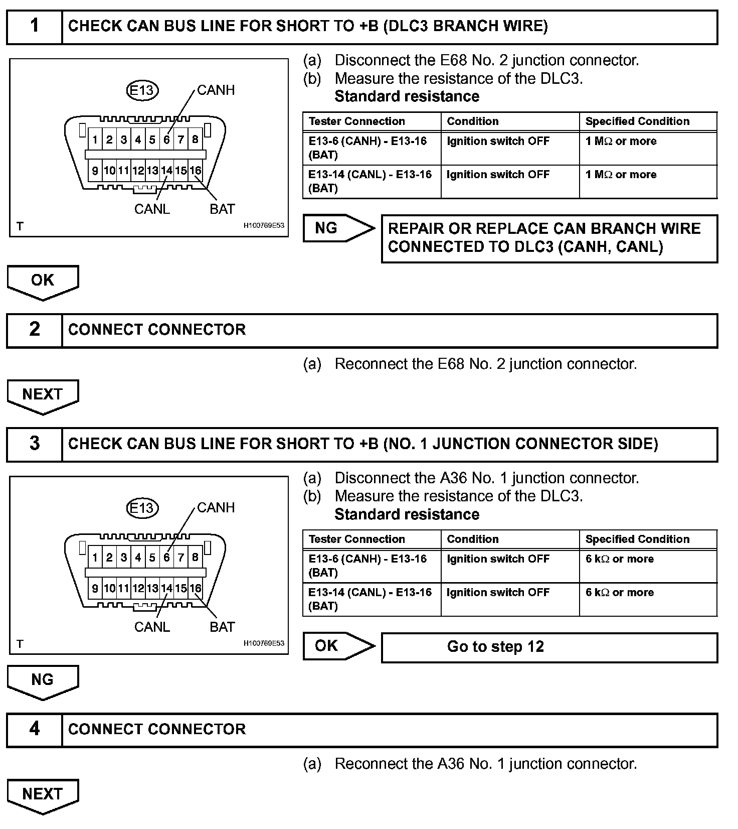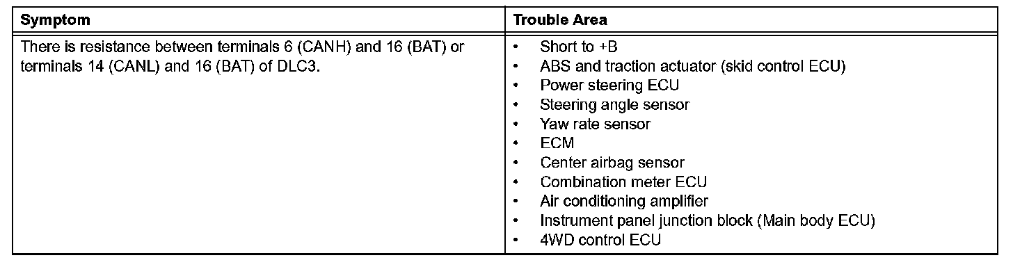 There may be a short circuit between the CAN bus line and +B when there is resistance between terminals 6 (CANH) and 16 (BAT) or terminals 14 (CANL) and 16 (BAT) of the DLC3.