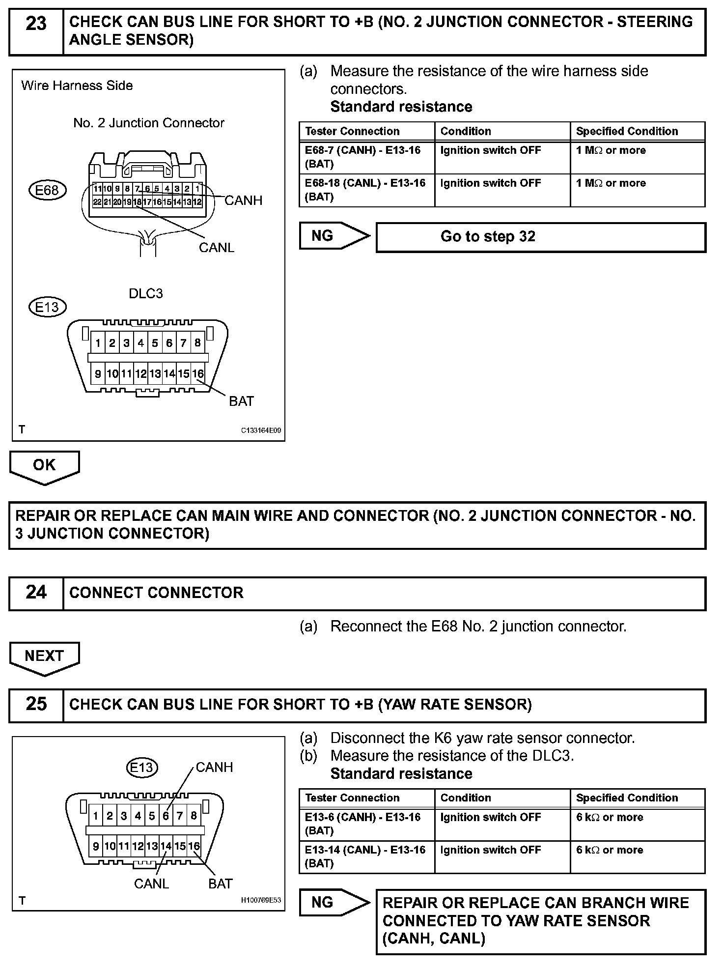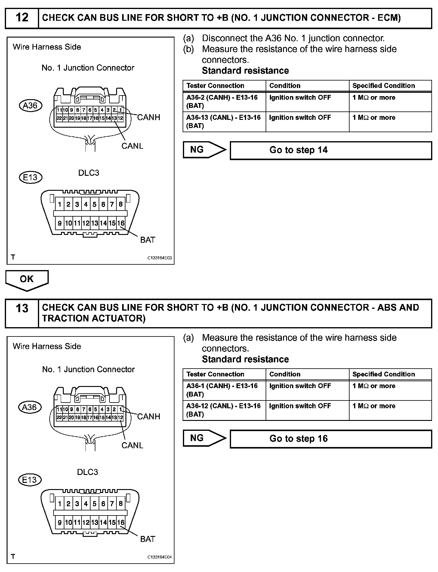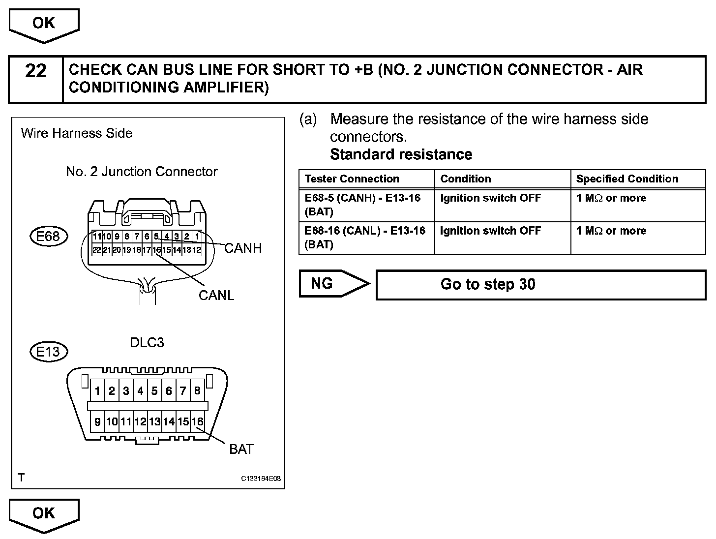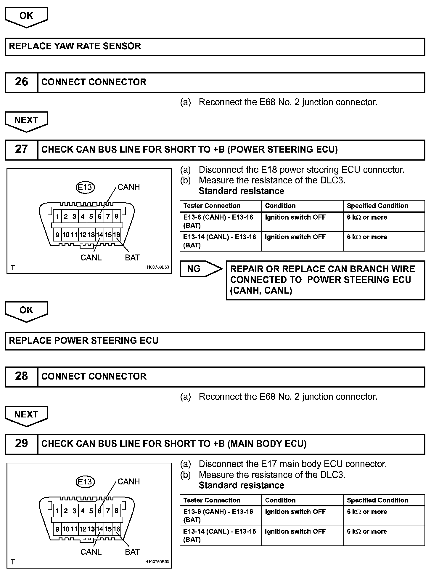 There may be a short circuit between the CAN bus line and +B when there is resistance between terminals 6 (CANH) and 16 (BAT) or terminals 14 (CANL) and 16 (BAT) of the DLC3.