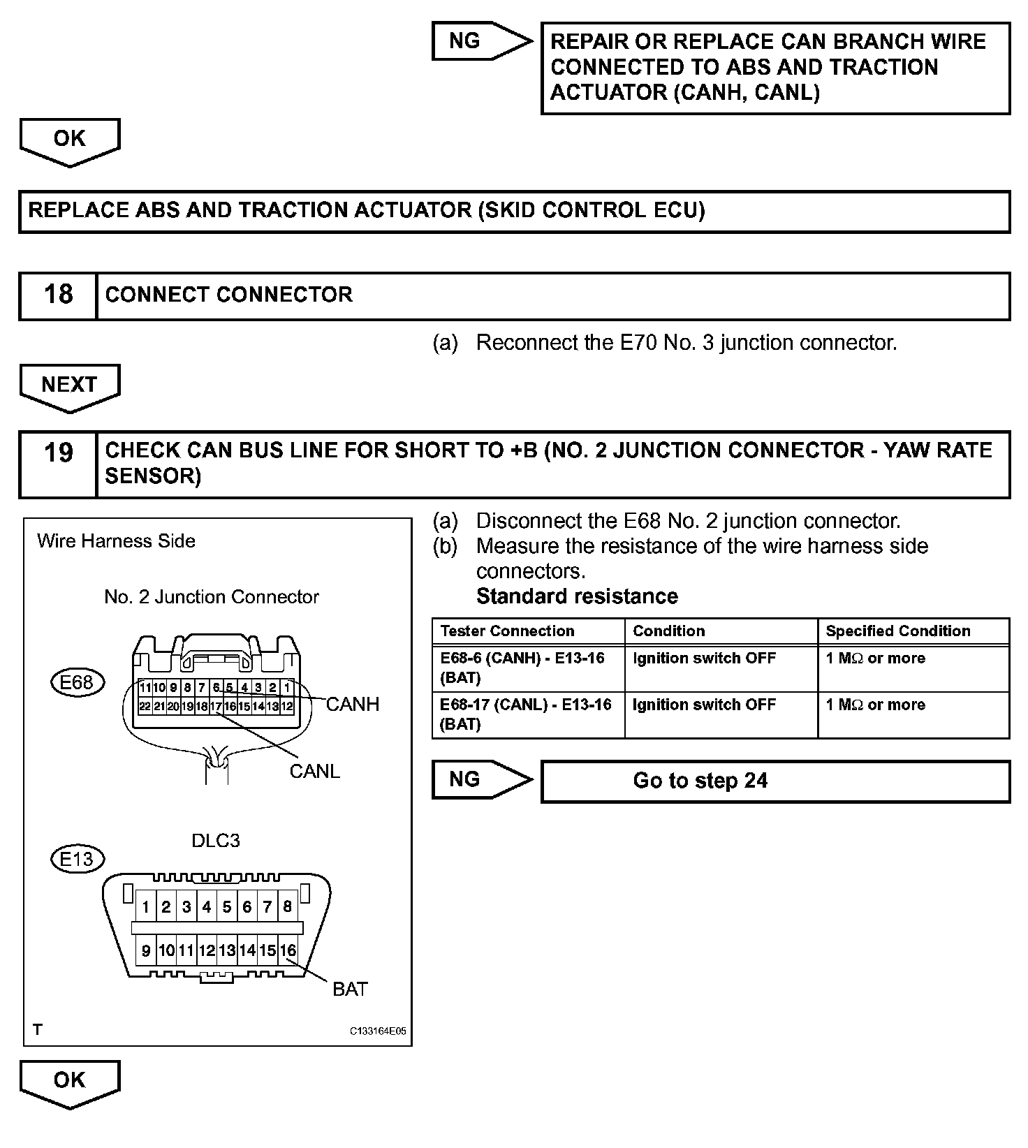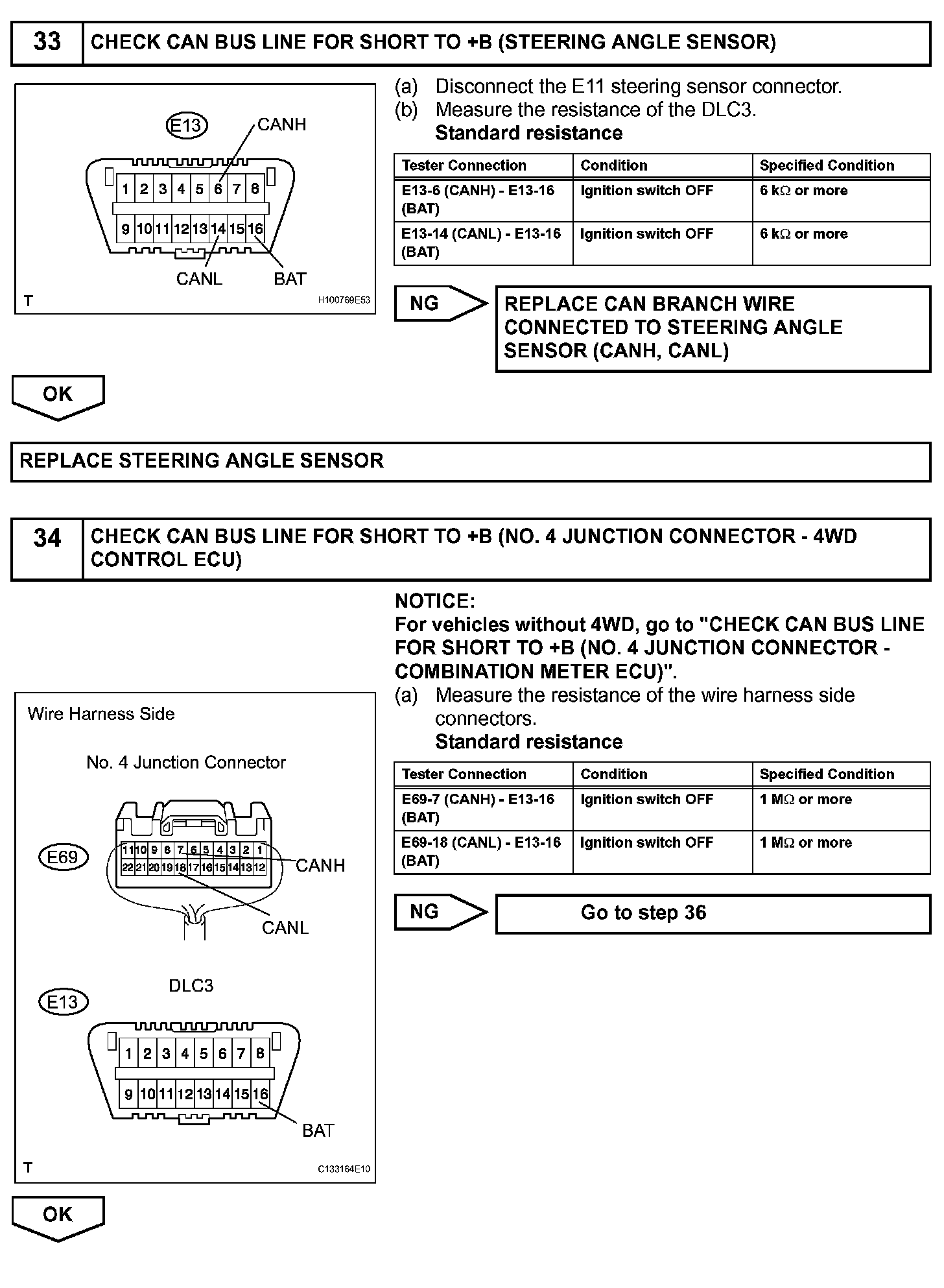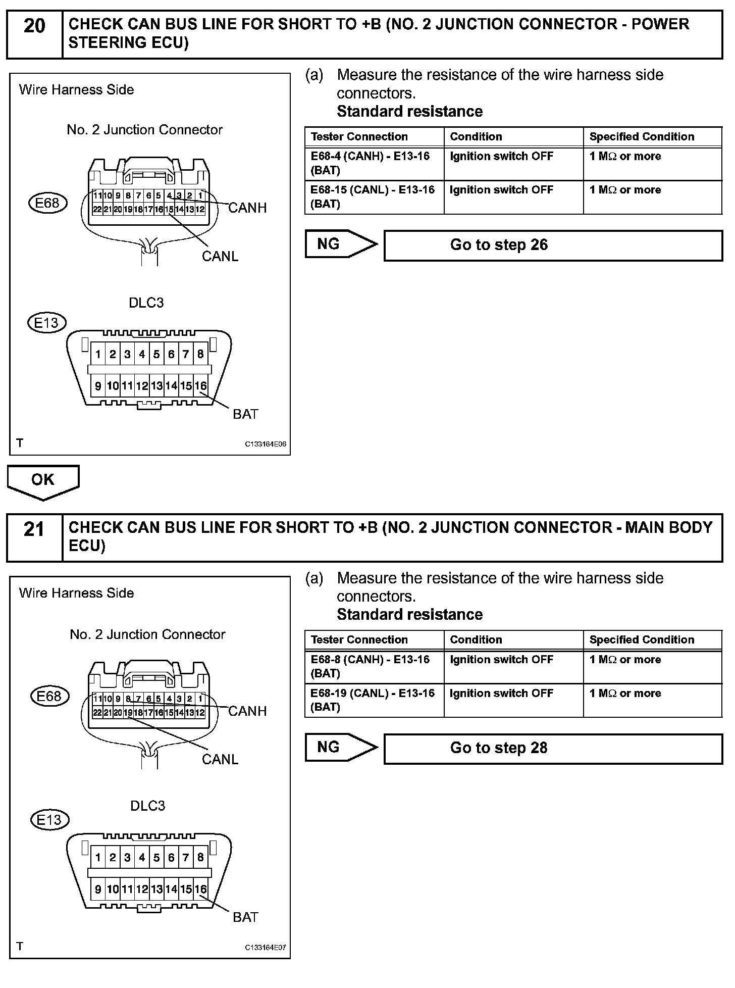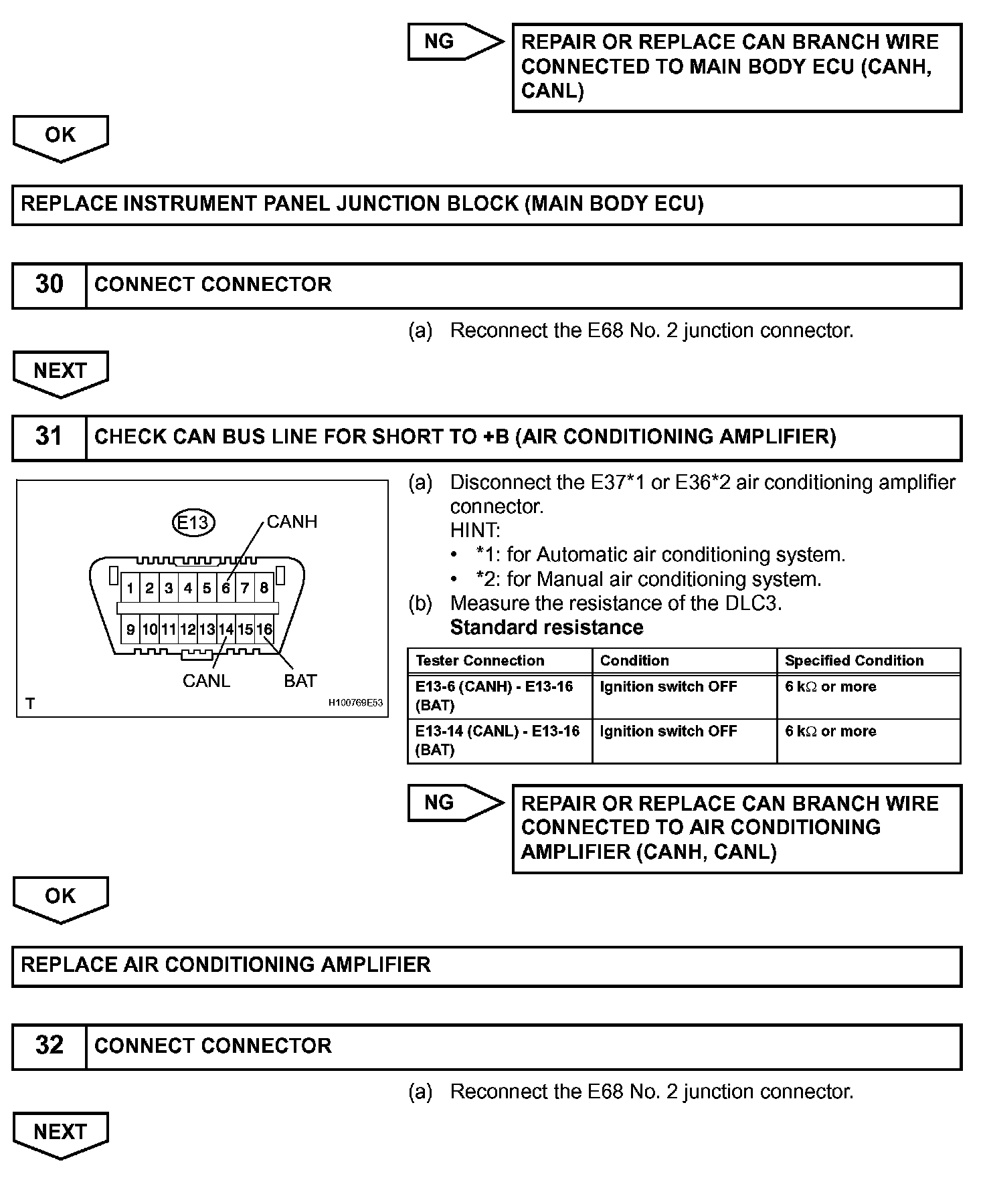 There may be a short circuit between the CAN bus line and +B when there is resistance between terminals 6 (CANH) and 16 (BAT) or terminals 14 (CANL) and 16 (BAT) of the DLC3.