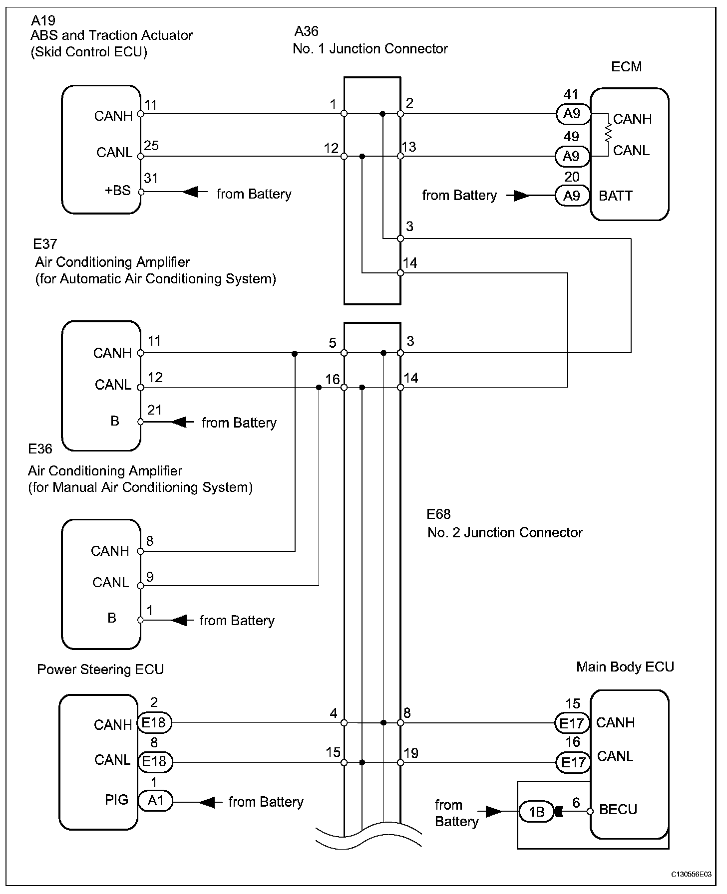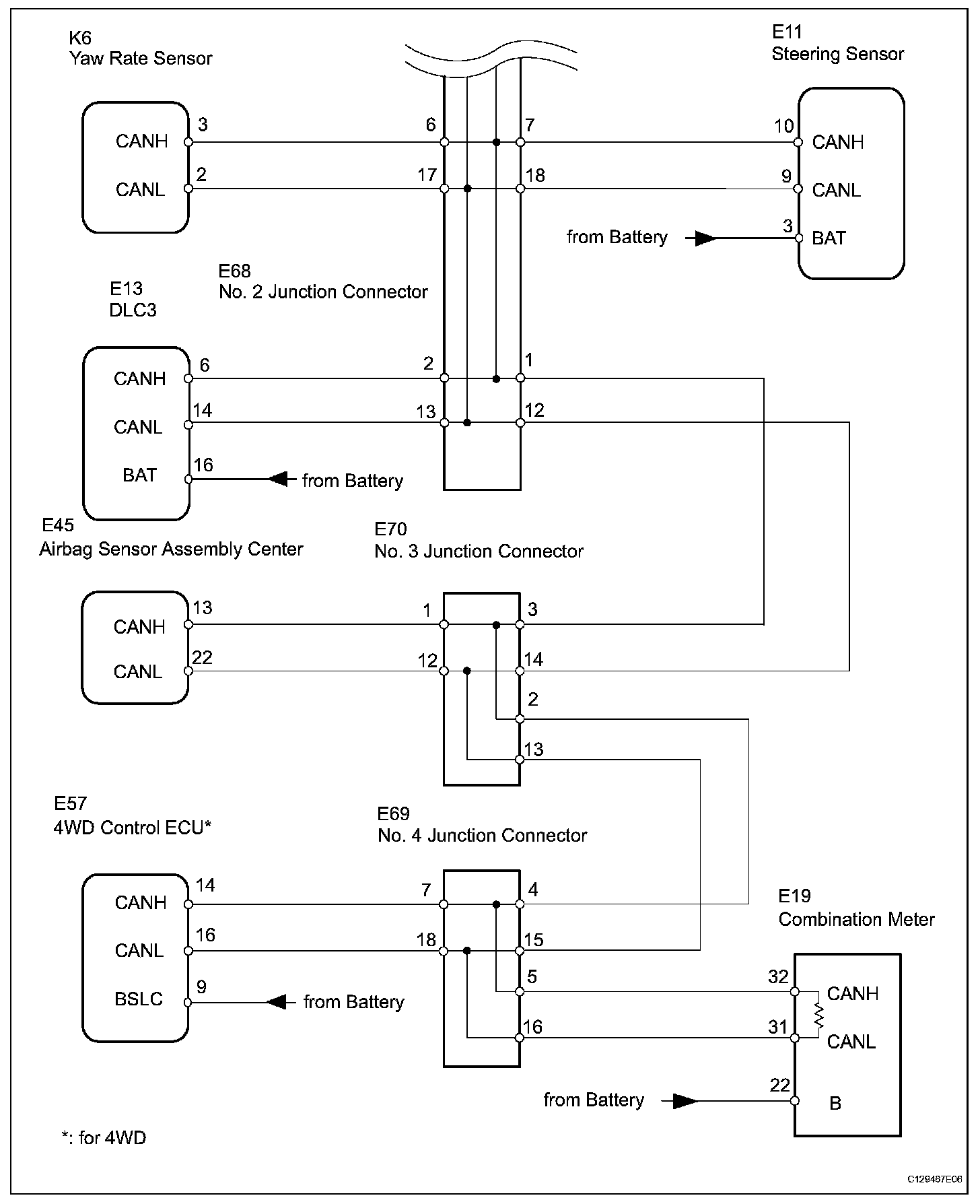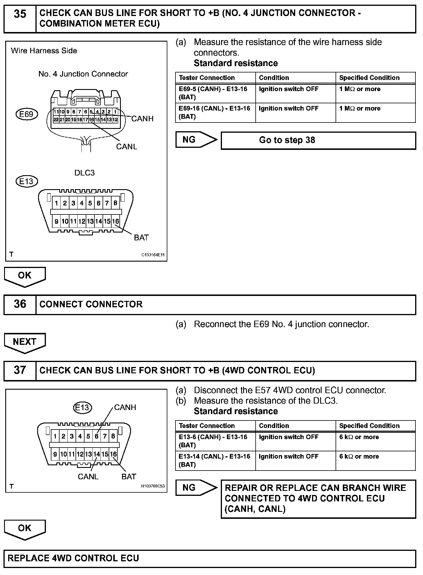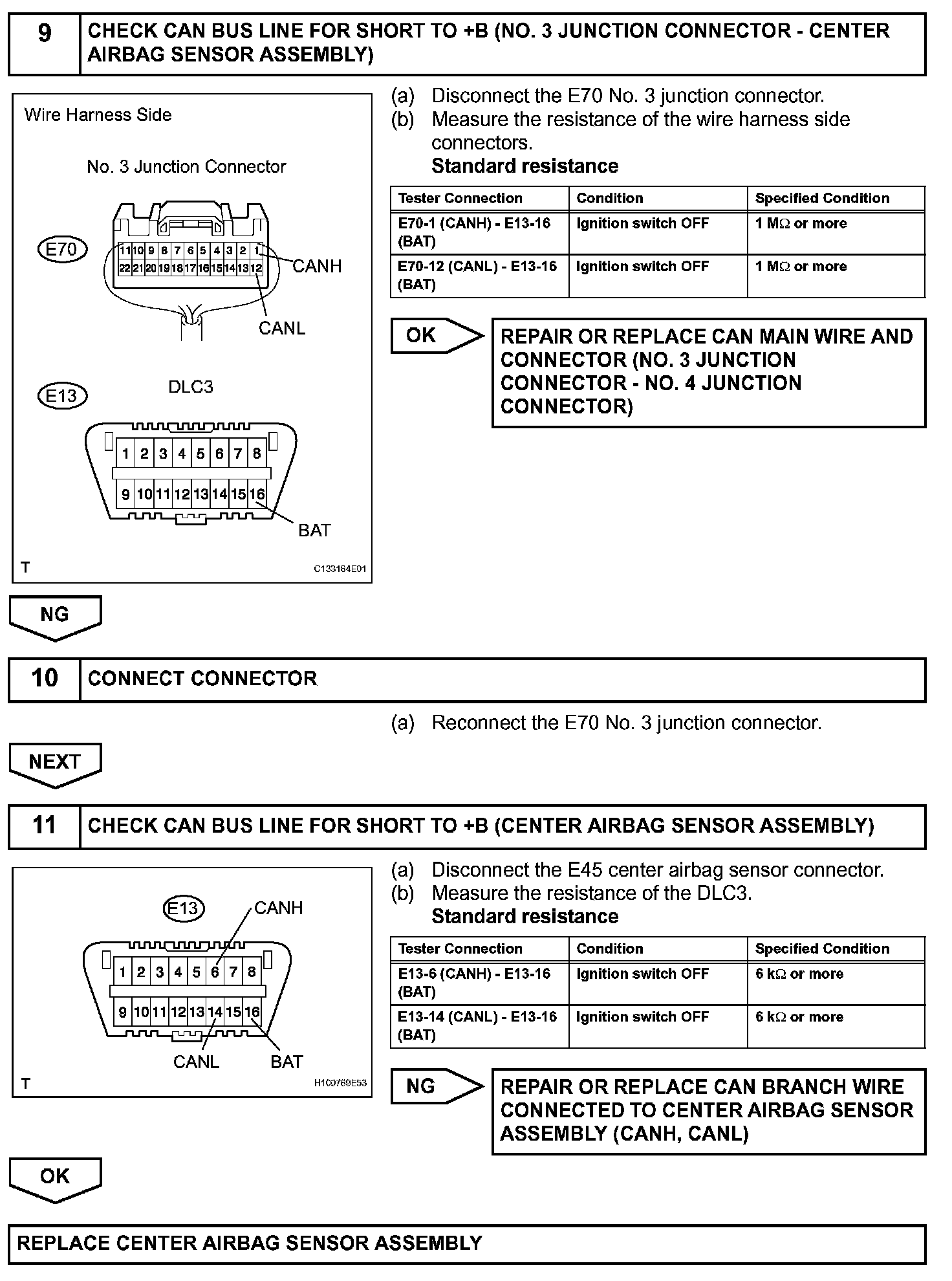 There may be a short circuit between the CAN bus line and +B when there is resistance between terminals 6 (CANH) and 16 (BAT) or terminals 14 (CANL) and 16 (BAT) of the DLC3.