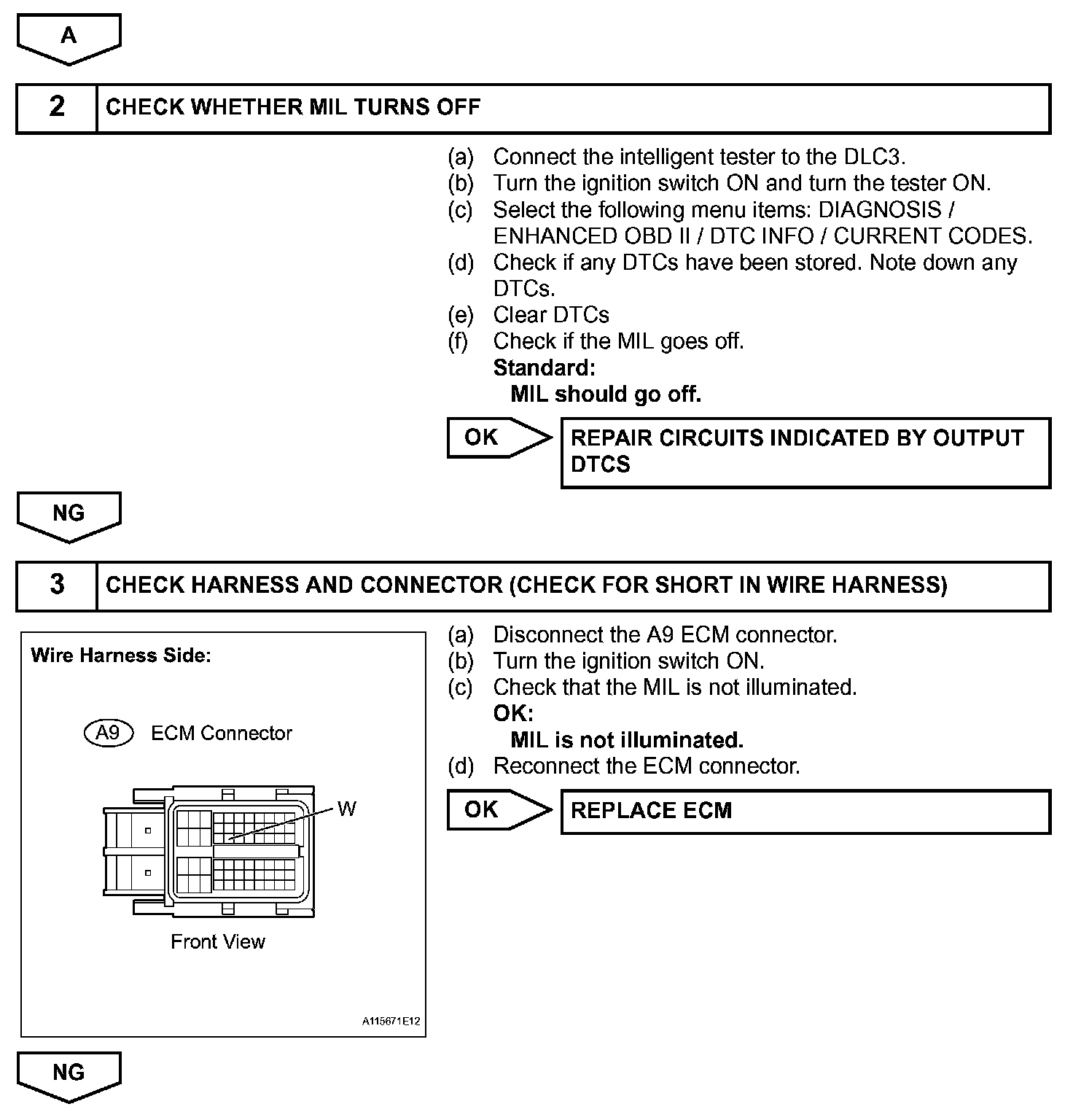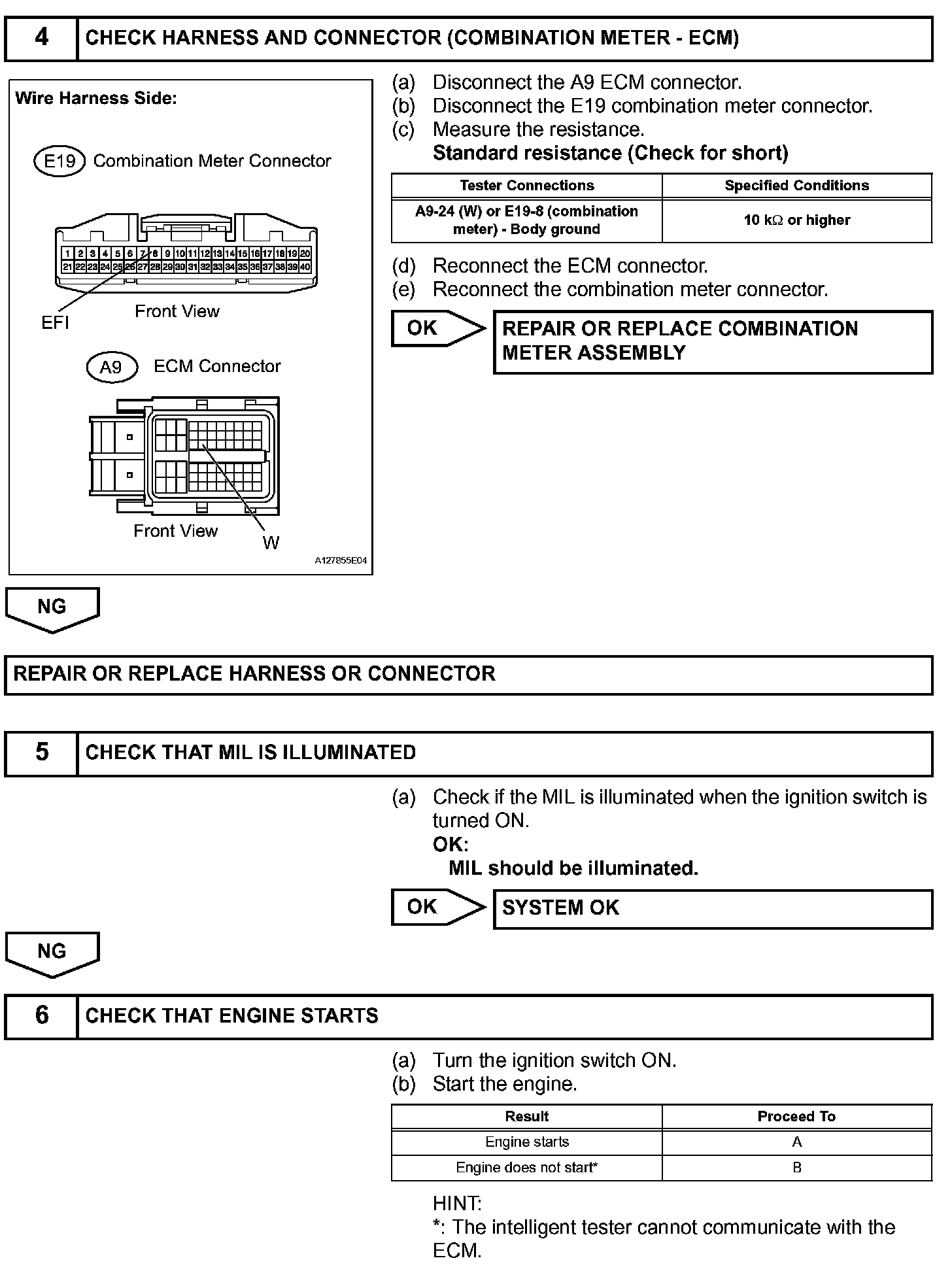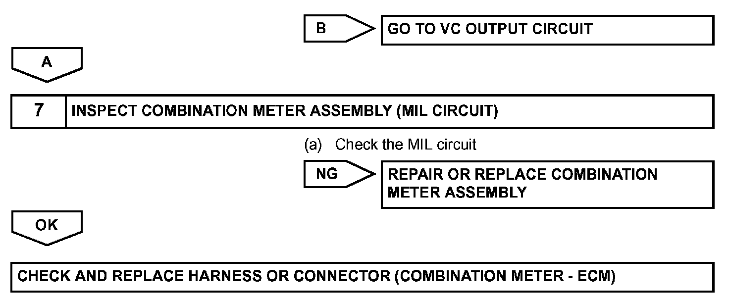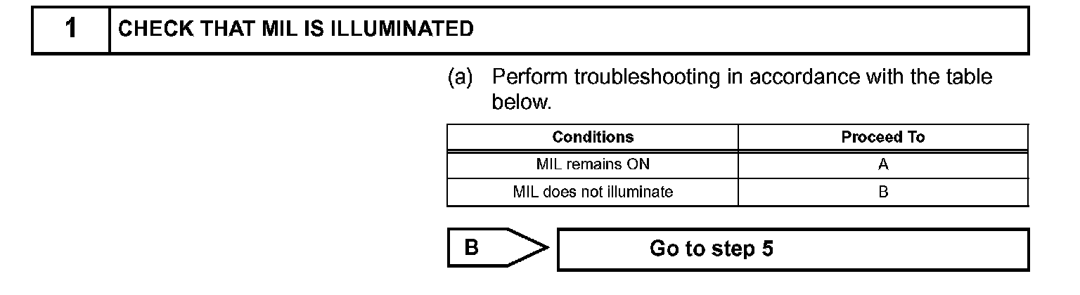 The MIL operation can be checked visually: When the ignition switch is first turned ON, the MIL should be illuminated and should then turn off. If the MIL remains illuminated or is not illuminated, conduct the following troubleshooting procedure using the intelligent tester.