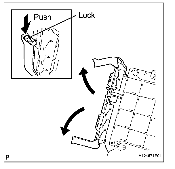 1. Raise the 2 levers while pushing the locks on the 2 levers, and disconnect the 2 ECM connectors.