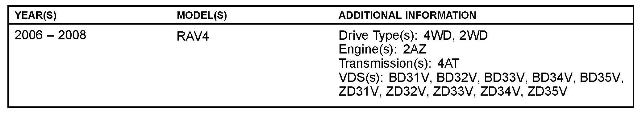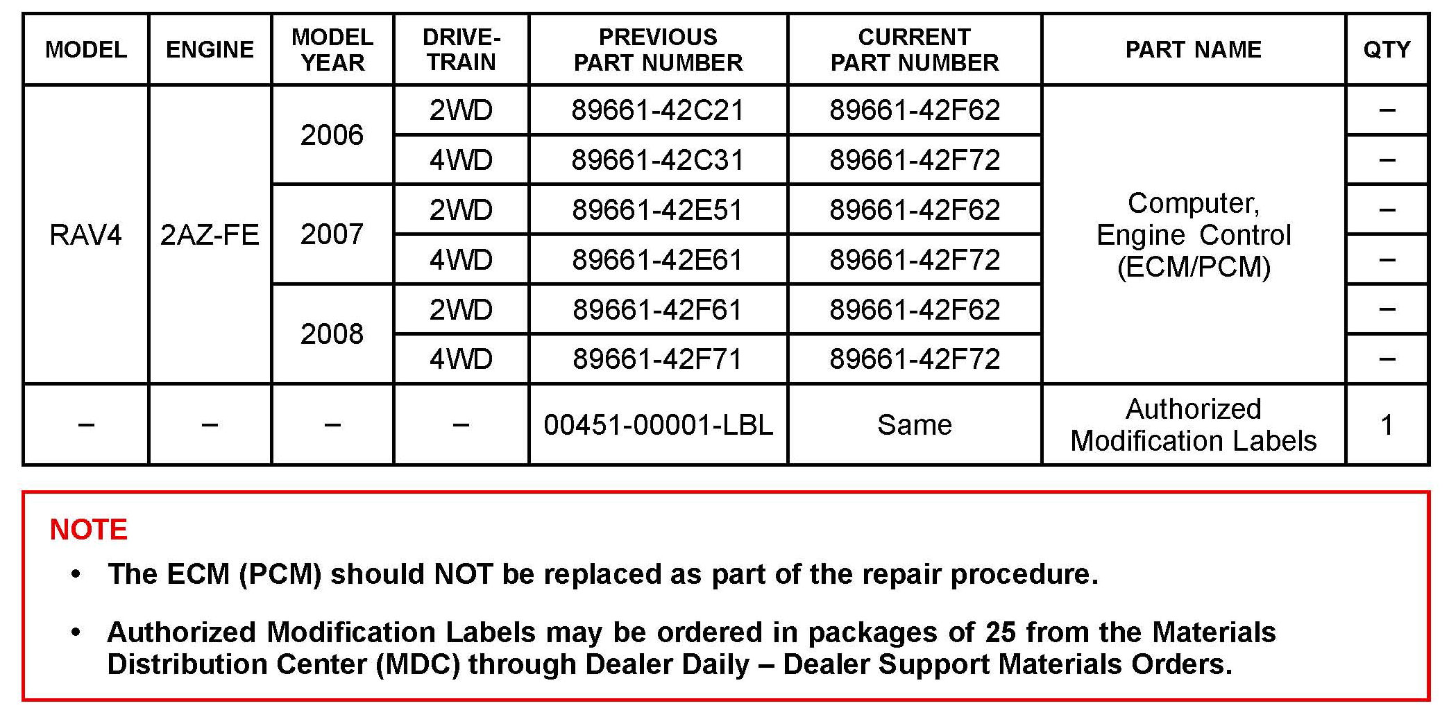 Some 2006 - 2008 model year RAV4 vehicles equipped with 2AZ-FE engines may exhibit a MIL "ON" condition with Diagnostic Trouble Code (DTC) P0456 - Evaporative Emission Control System Leak Detected (Very Small Leak). The Engine Control Module/ECM (SAE term: Powertrain Control Module/PCM) logic has been modified to reduce the possibility of this condition occurring.