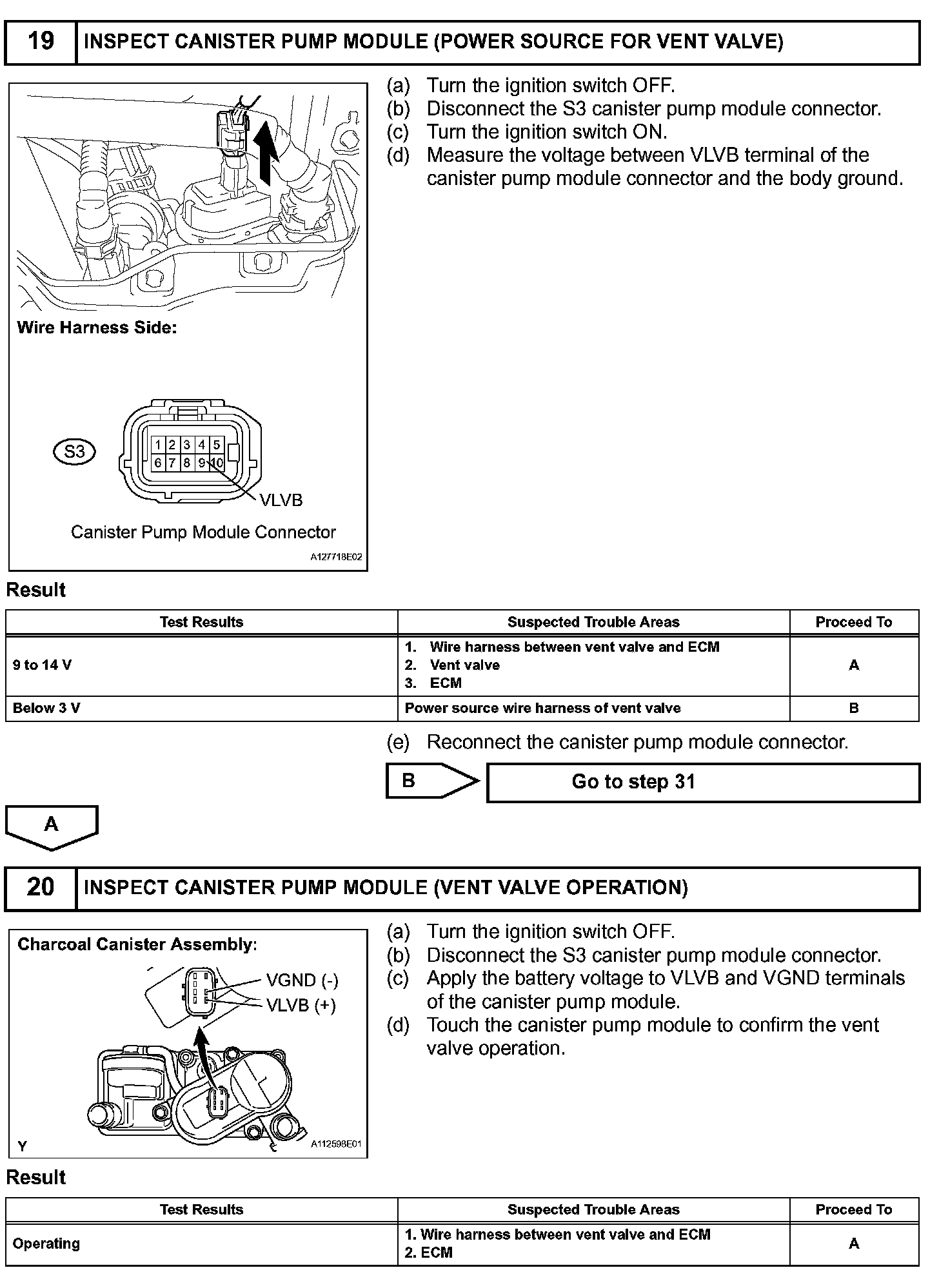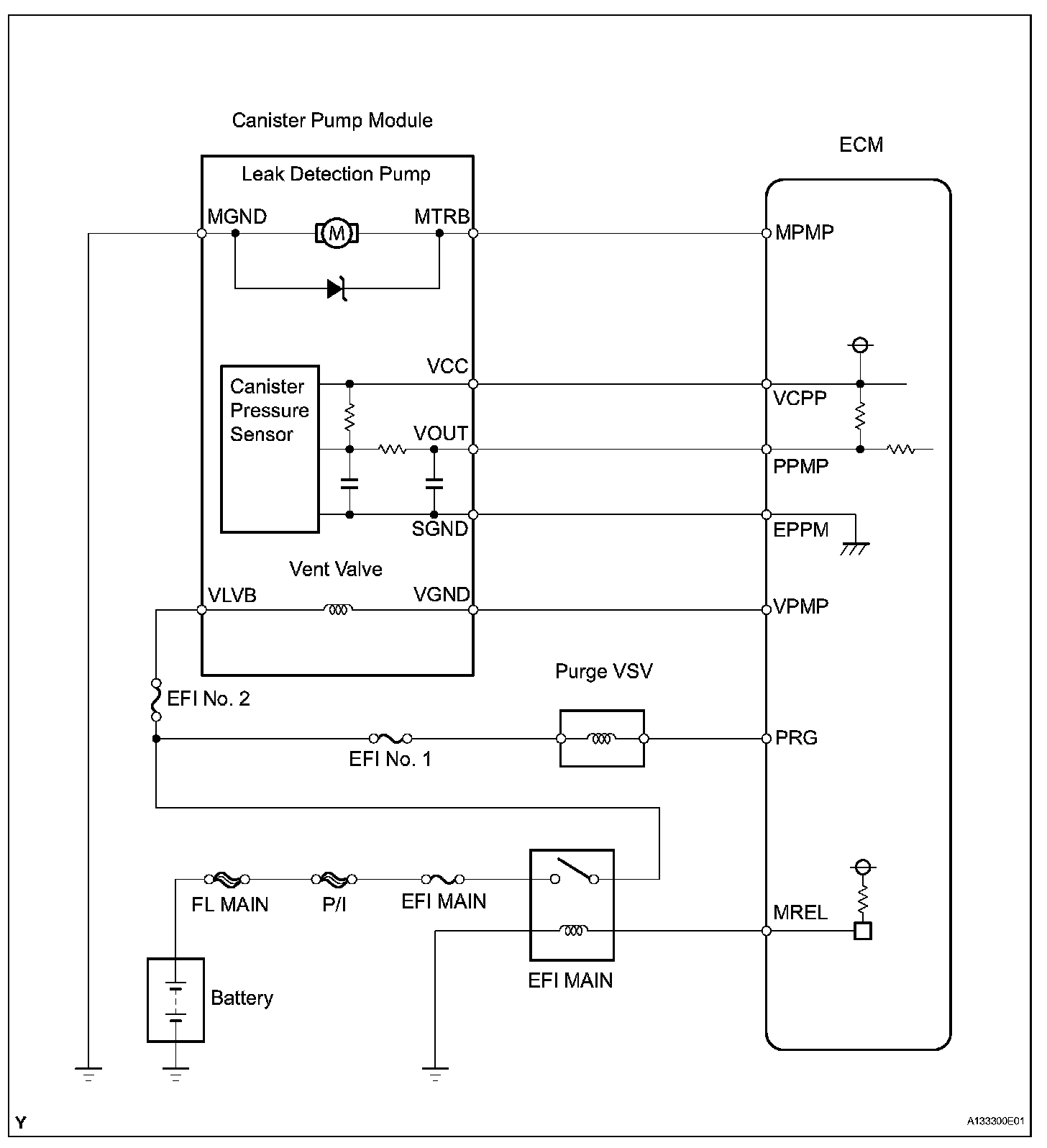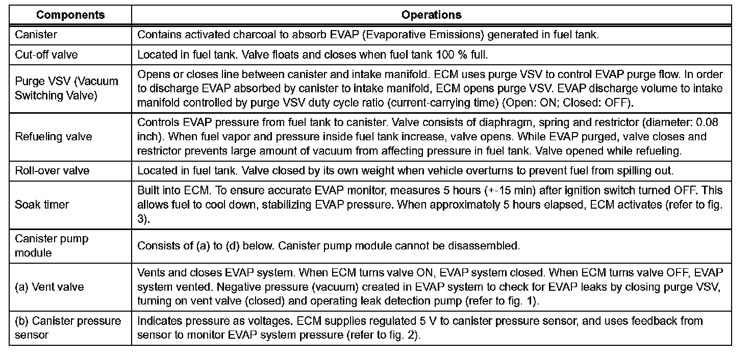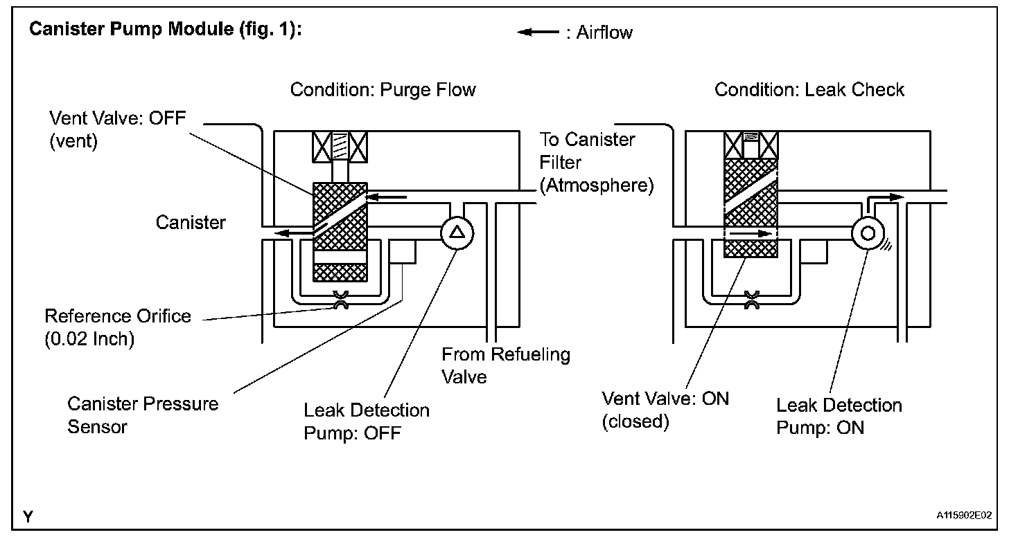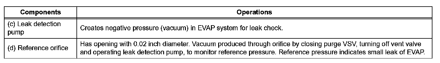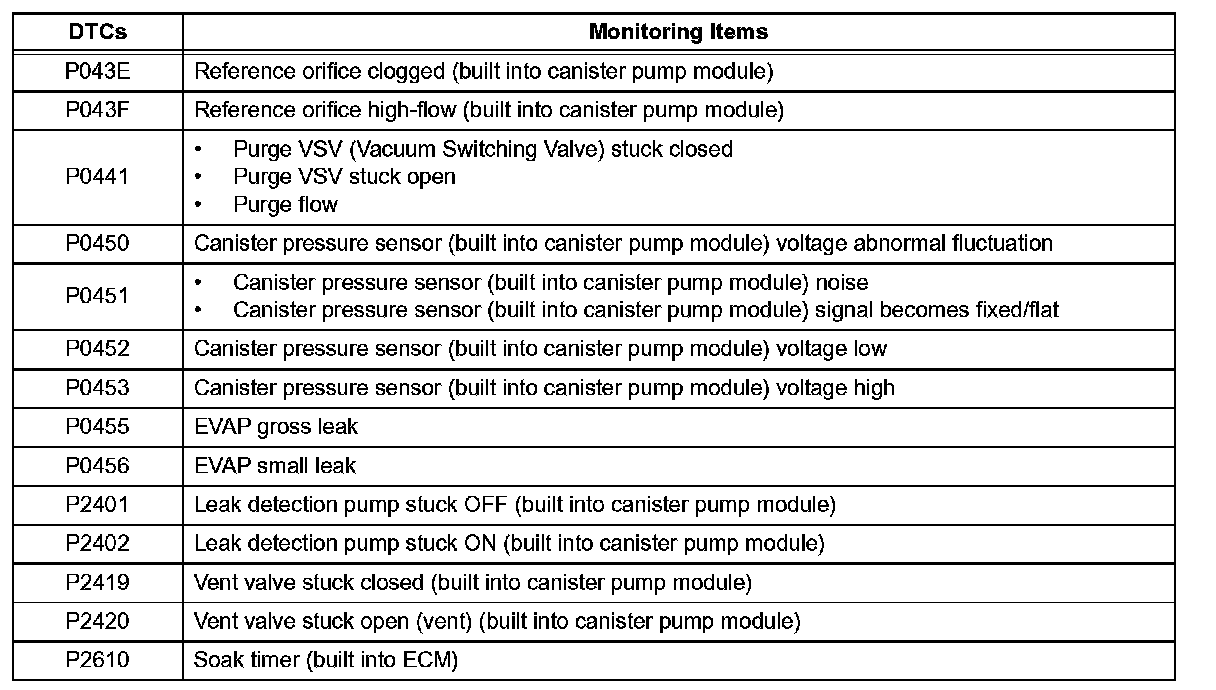 The leak detection pump creates negative pressure (vacuum) in the EVAP system and the pressure is measured. Finally, the ECM monitors for leaks from the EVAP system, and malfunctions in both the canister pump module and purge VSV, based on the EVAP pressure.