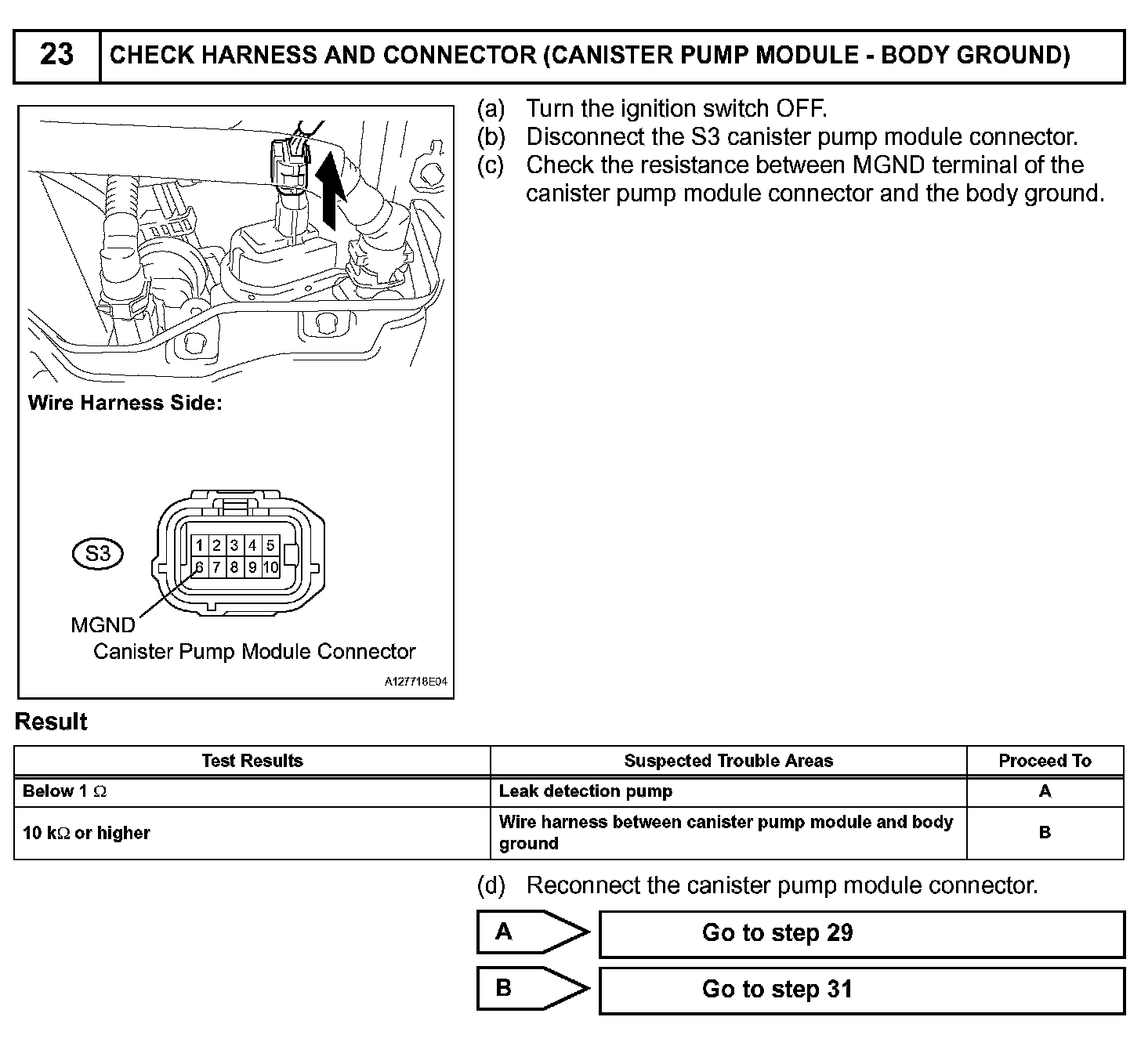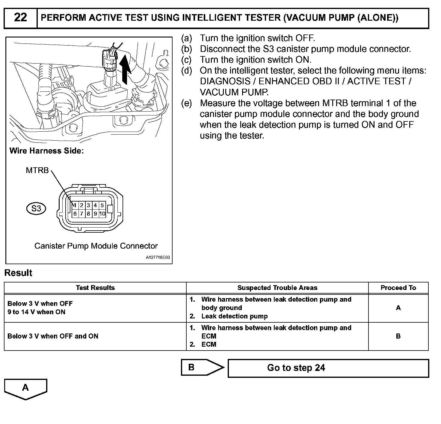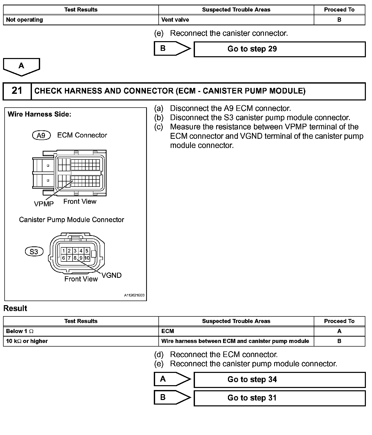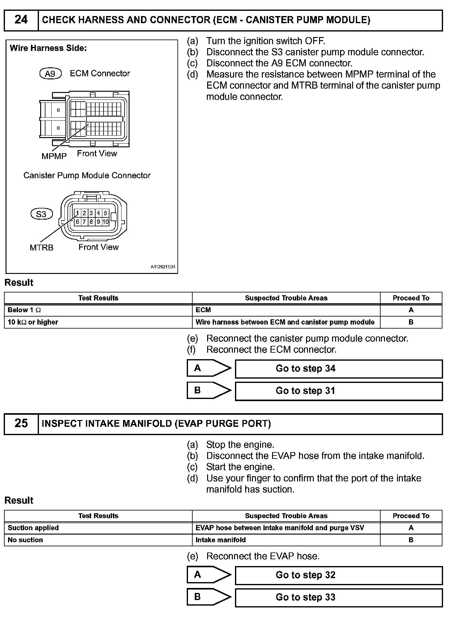 The leak detection pump creates negative pressure (vacuum) in the EVAP system and the pressure is measured. Finally, the ECM monitors for leaks from the EVAP system, and malfunctions in both the canister pump module and purge VSV, based on the EVAP pressure.